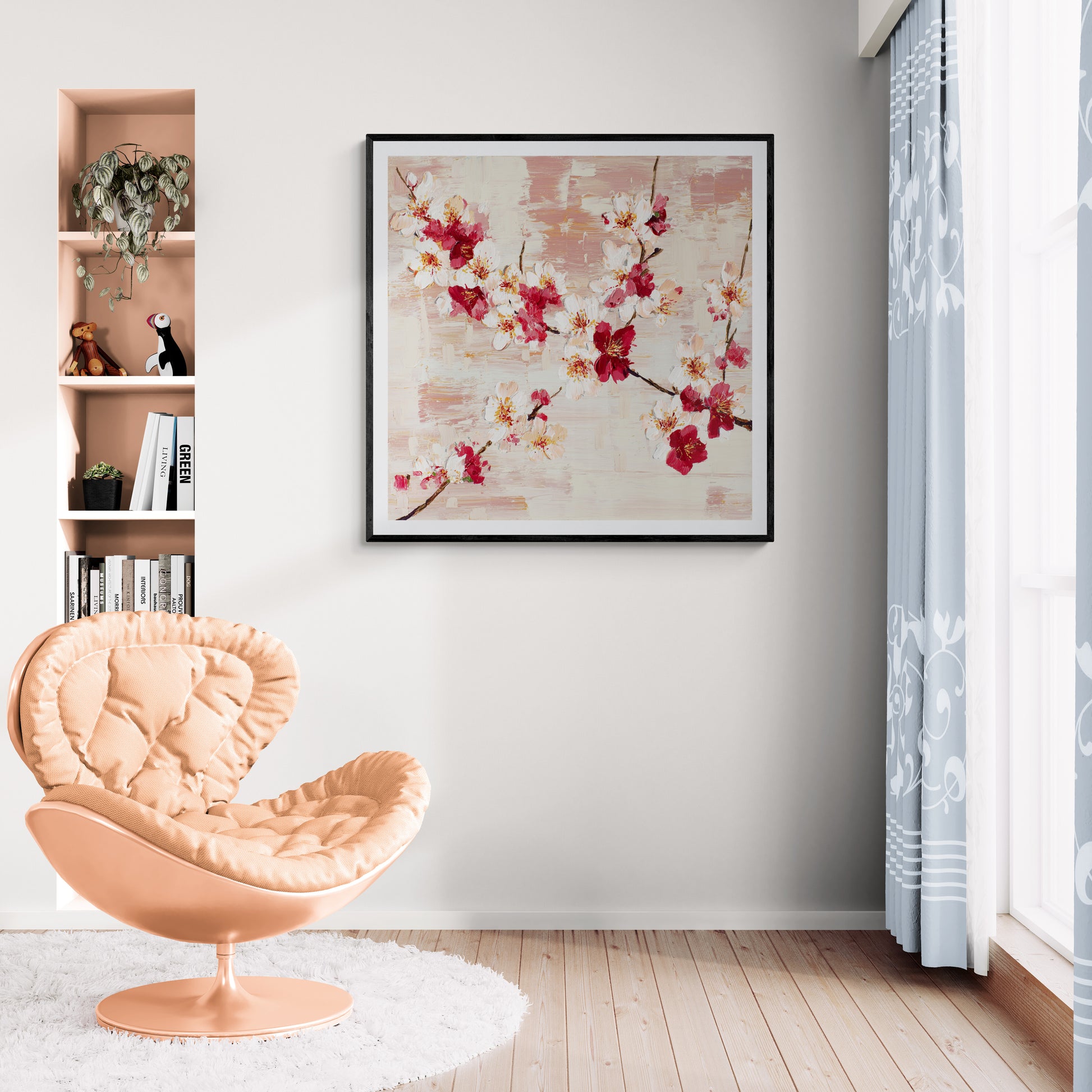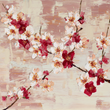 A vibrant, painterly artwork depicting branches laden with blossoms.