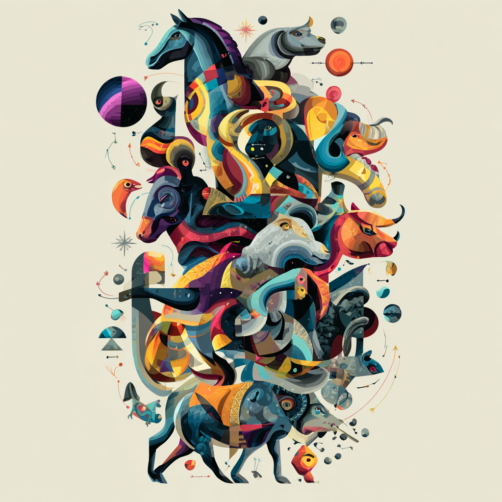 Style: The image uses a Cubist or Geometric Abstract approach, where the animals are broken down into sharp, interlocking planes of color. It maintains a slightly rugged texture, suggesting a highly detailed, modern tapestry or graphic mural.
