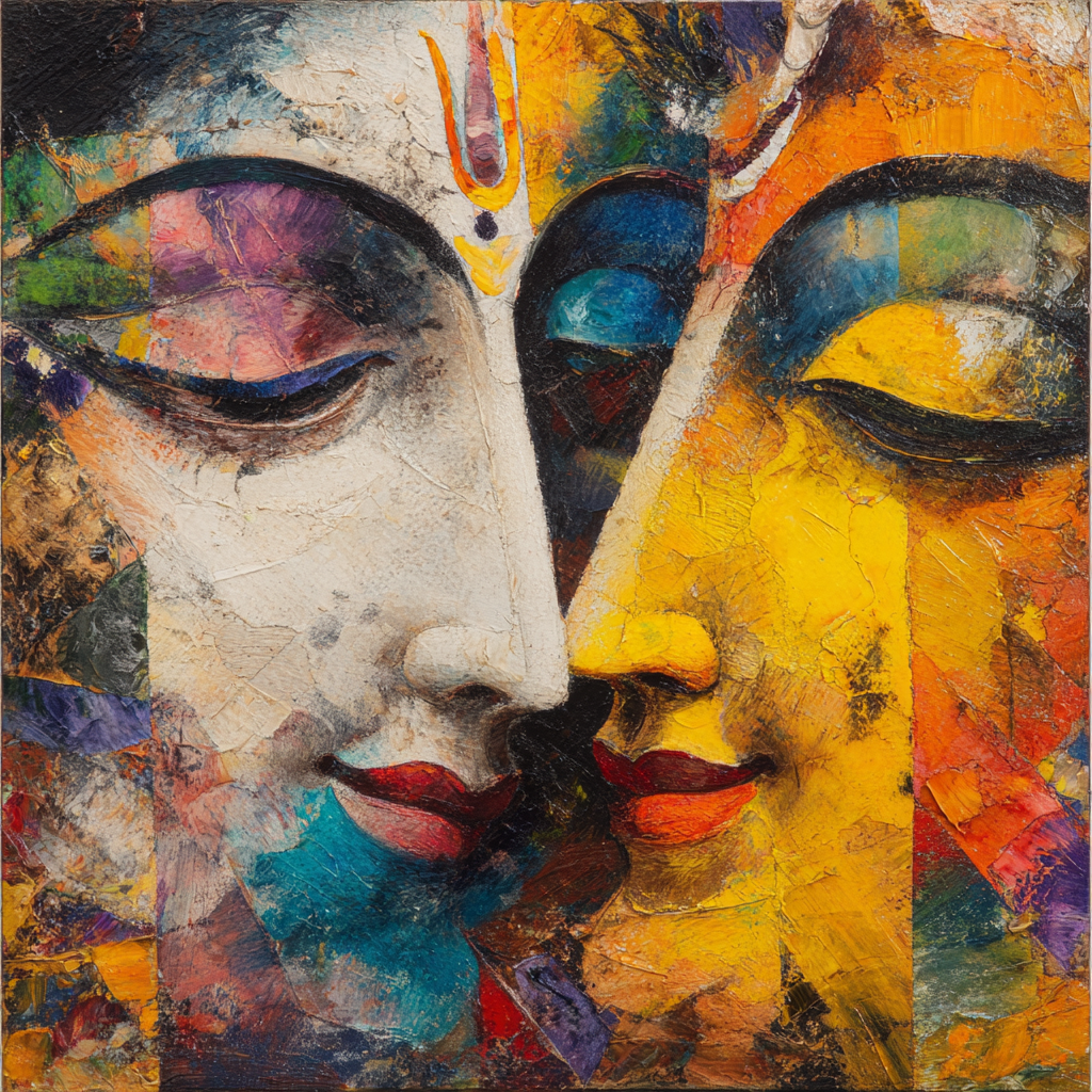 A powerful, close-up abstract expressionist painting depicting two faces in peaceful repose, positioned extremely close together to suggest unity or a single entity with dual aspects (like Shiva and Shakti, or Radha and Krishna).