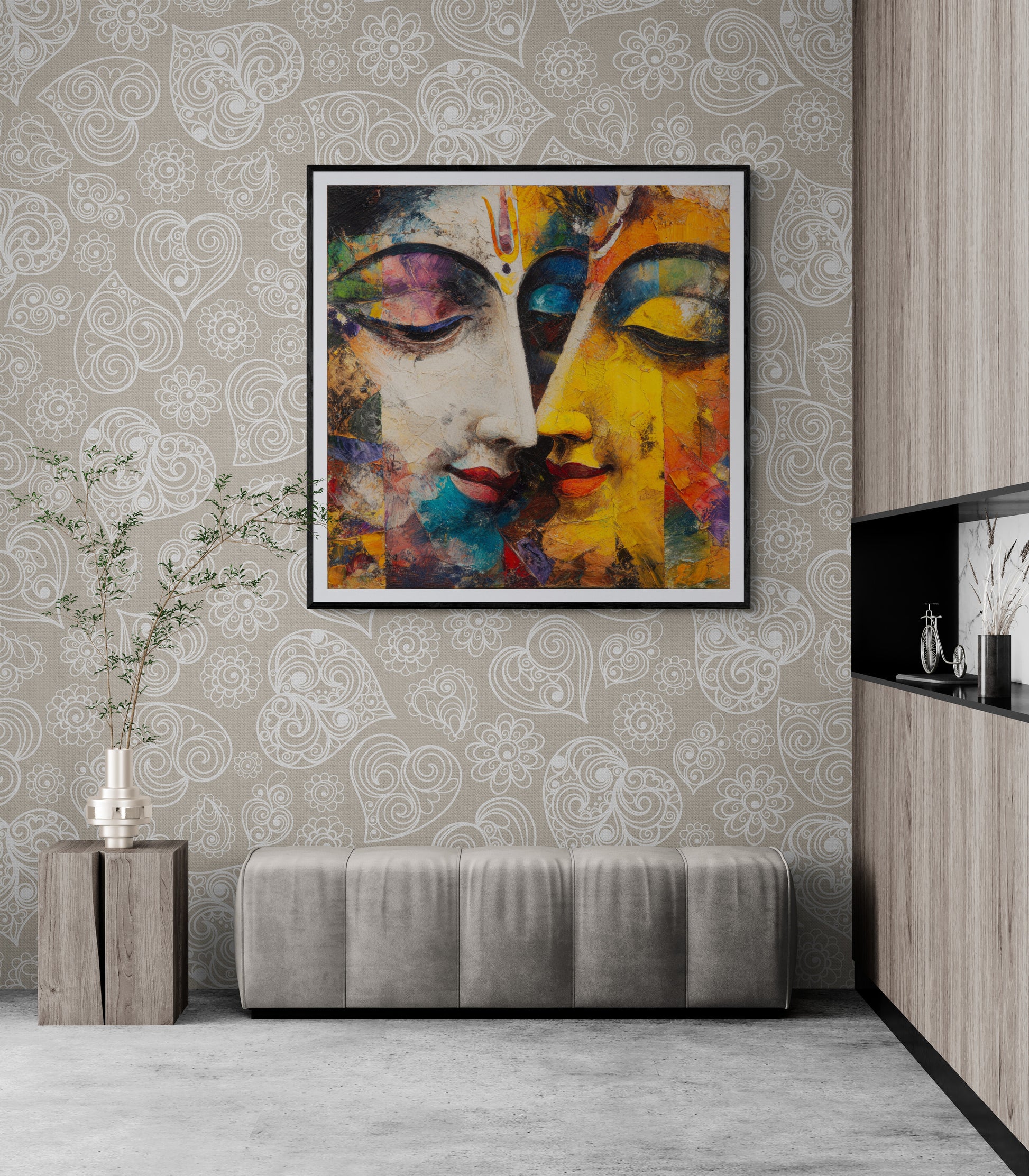 Both faces share closed eyes, red lips, and a stylized vertical mark (tilak) on the forehead where they meet, symbolizing a divine or spiritual bond.