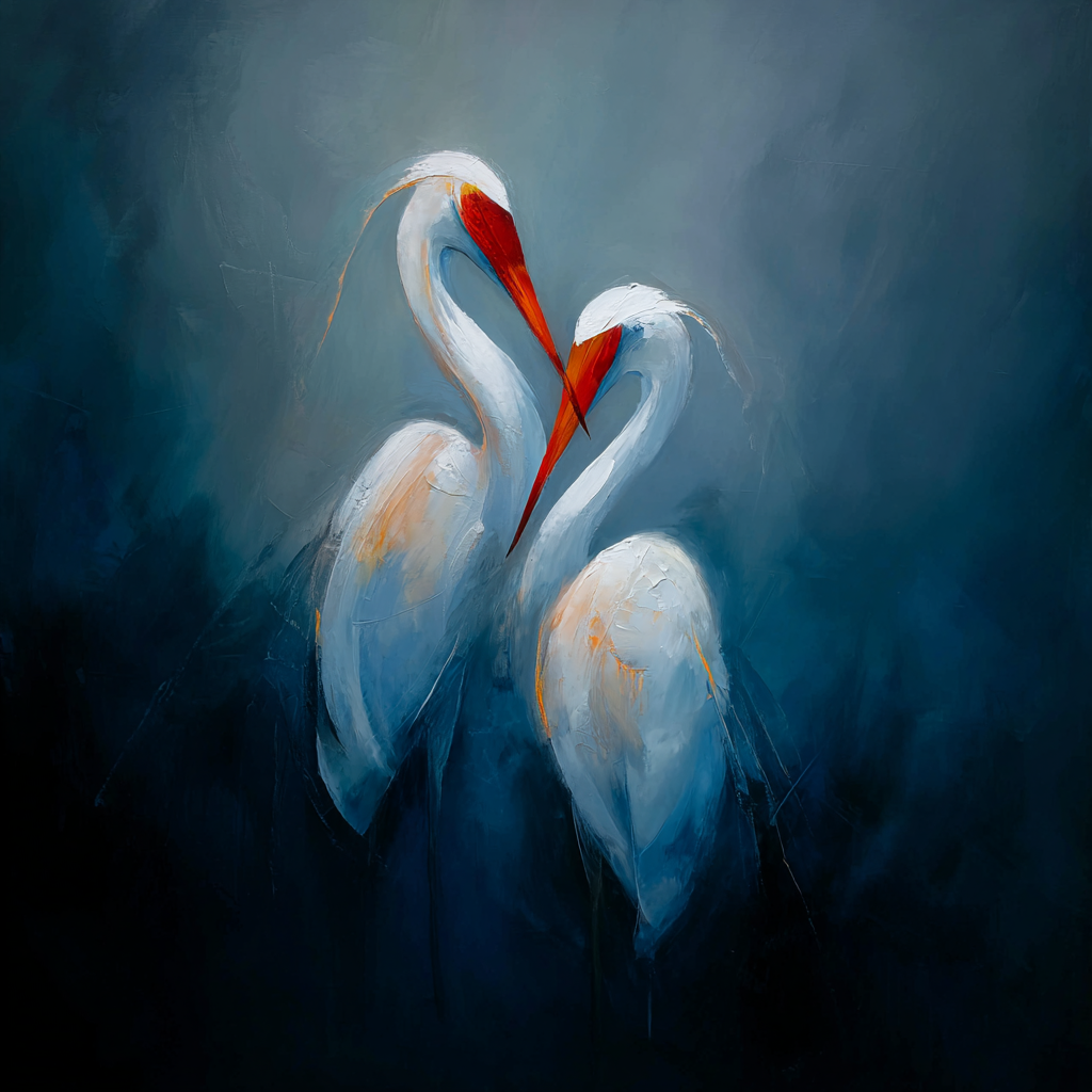 Mood: The composition is elegant, romantic, and quiet, evoking a sense of deep, tranquil emotion and grace. The dark, moody background highlights the luminosity and purity of the white birds.