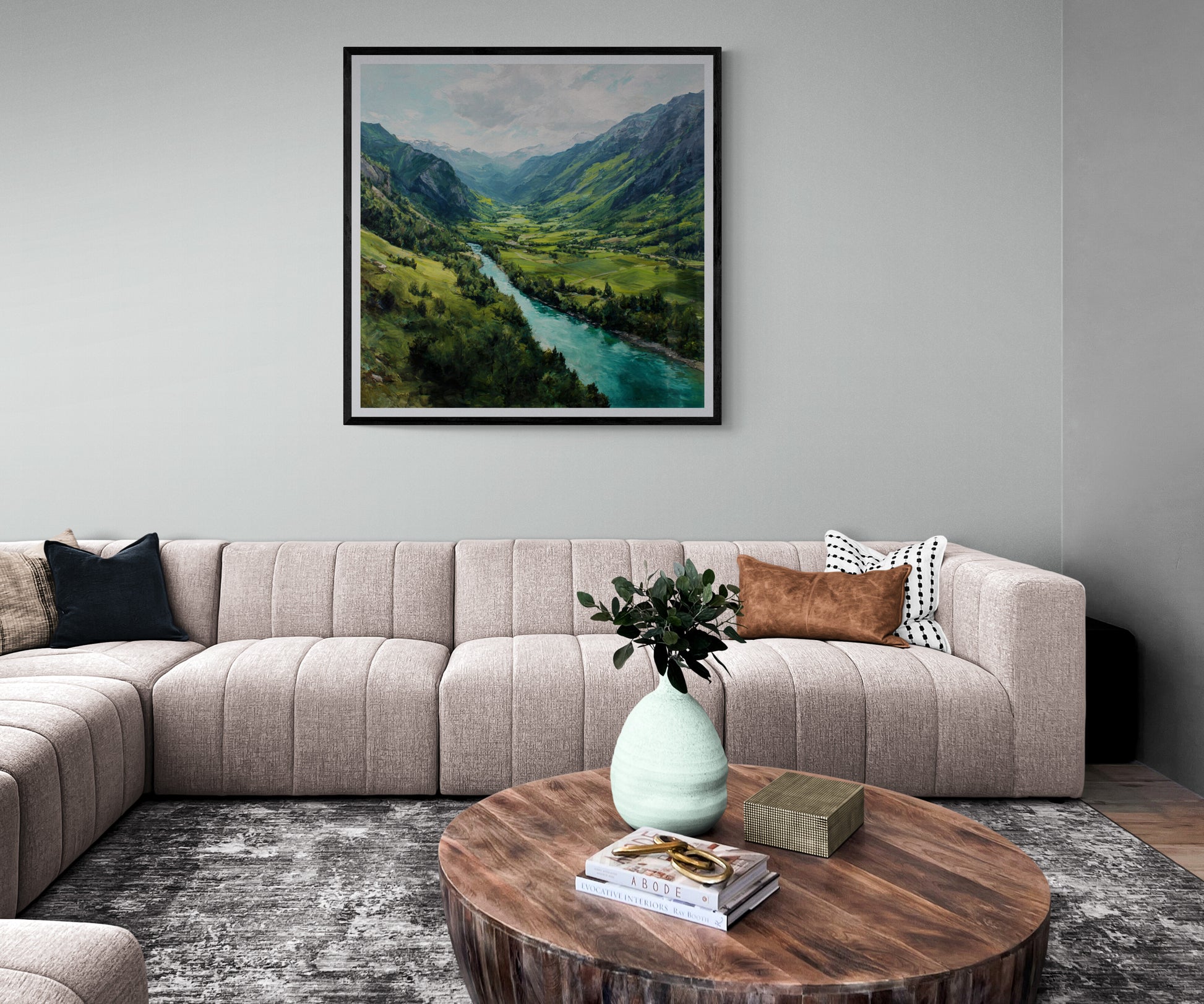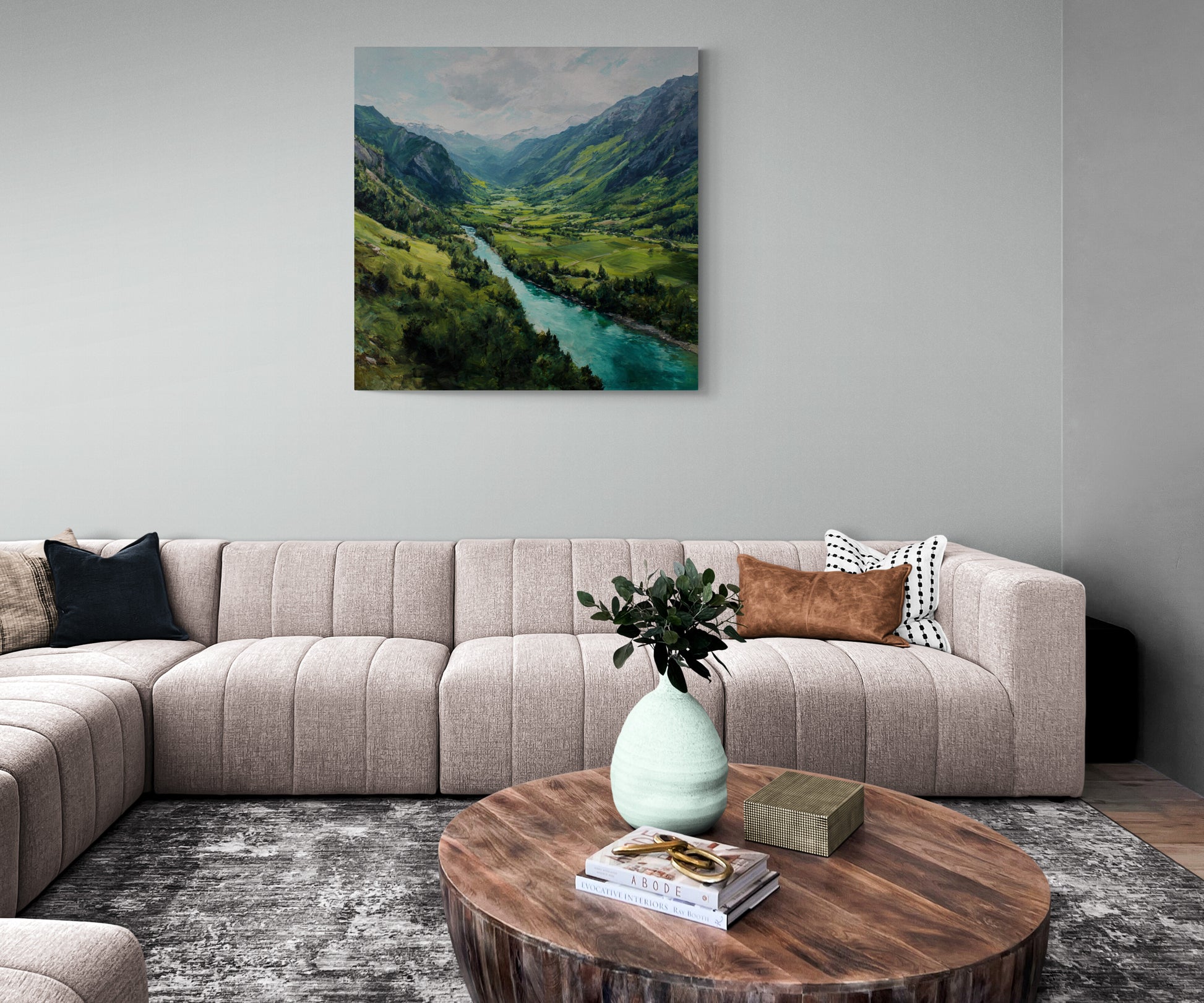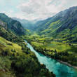 This is an incredibly vibrant and expansive landscape painting, focusing on a deep, fertile valley carved by a bright, clear river.
