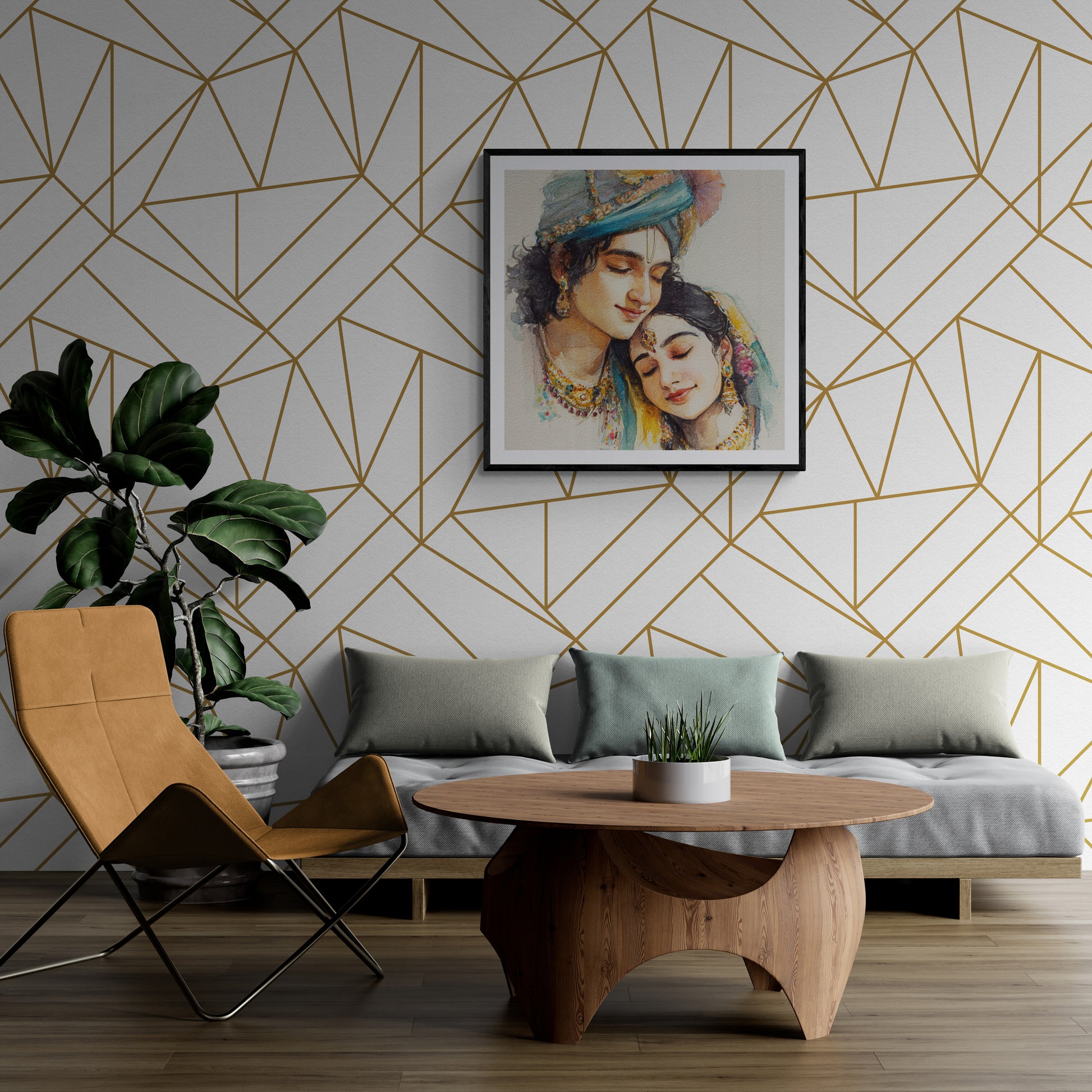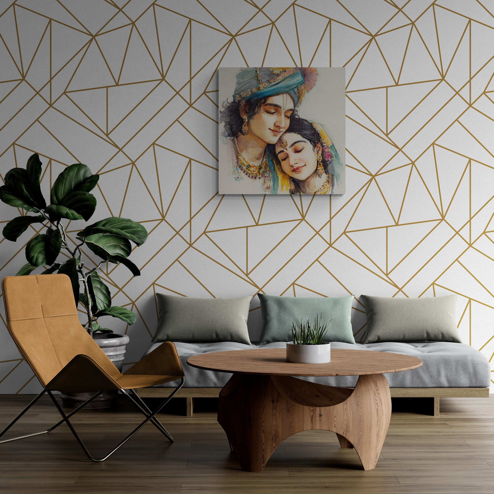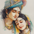A close-up, tender portrait of a loving couple, likely Radha and Krishna, rendered in a soft watercolor style.