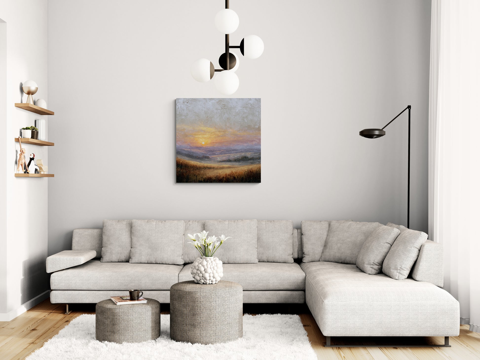 The painting is horizontally divided into distinct layers: textured sky, hazy hills, and a detailed foreground of grass, leading the eye directly toward the central light source.