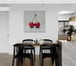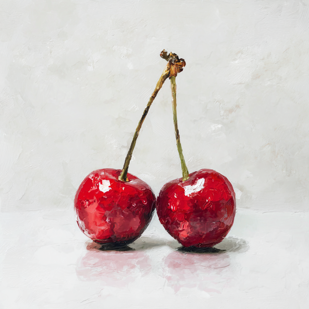 This is a vibrant and highly textured painting of two cherries, executed in a bold, expressive style that transforms the simple fruit into a striking still life composition.