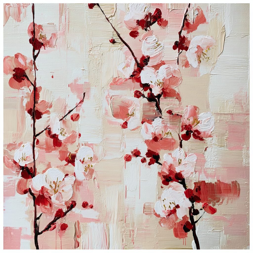 The colors are soft pink and white for the flowers, deep red/burgundy for accents, and dark brown for the branches.
