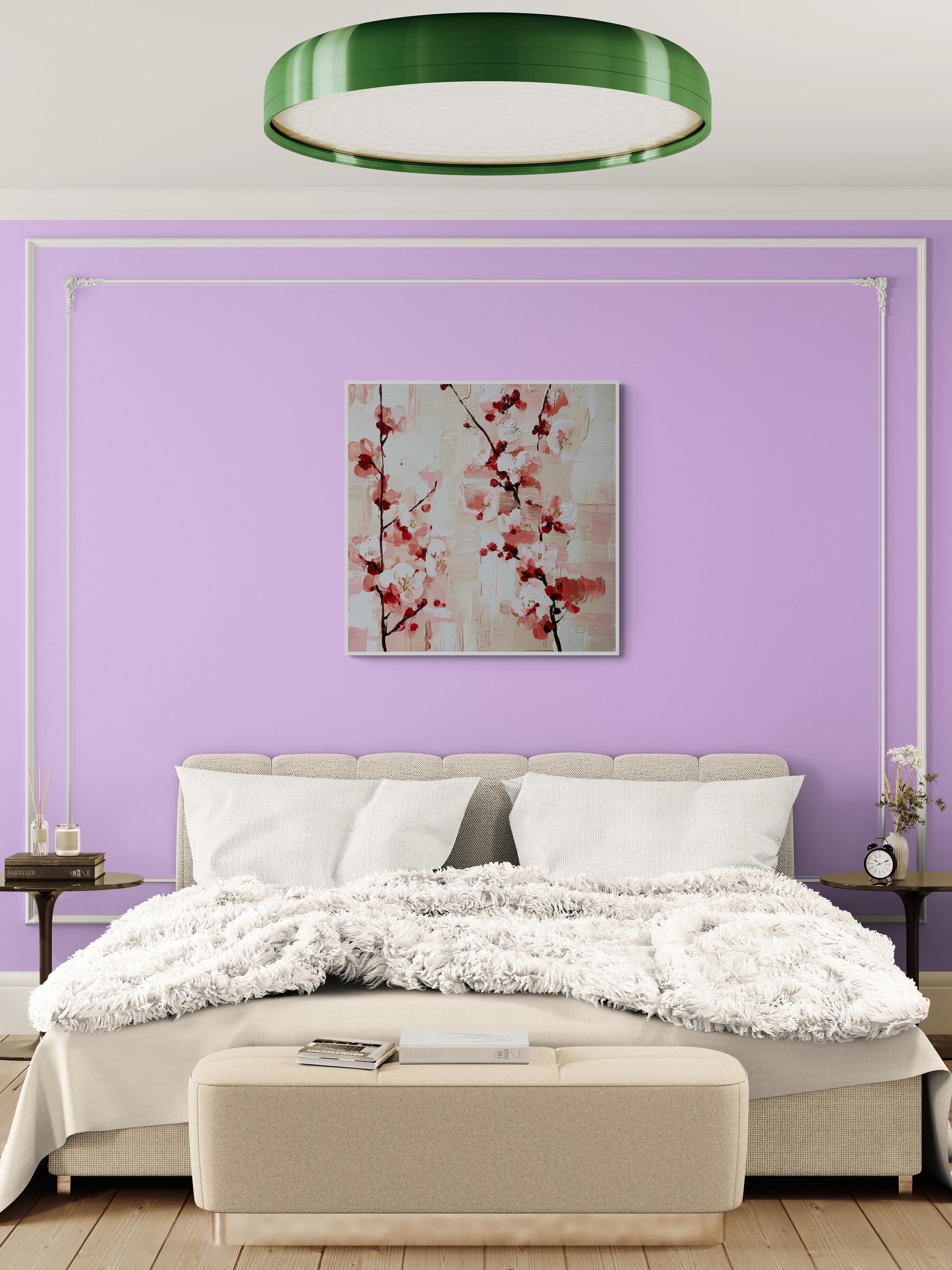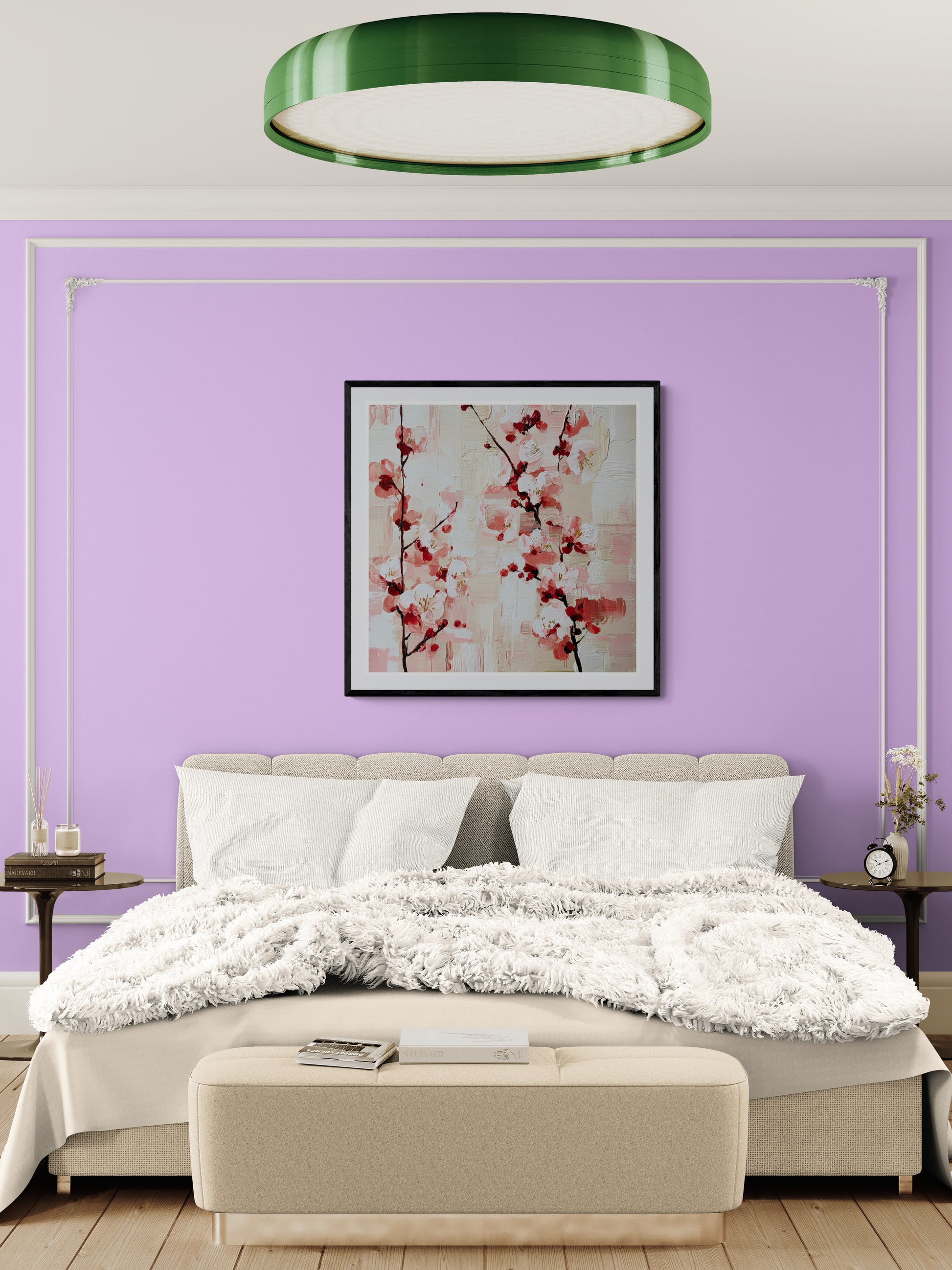 A vibrant painting depicting branches of cherry or apple blossoms.