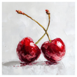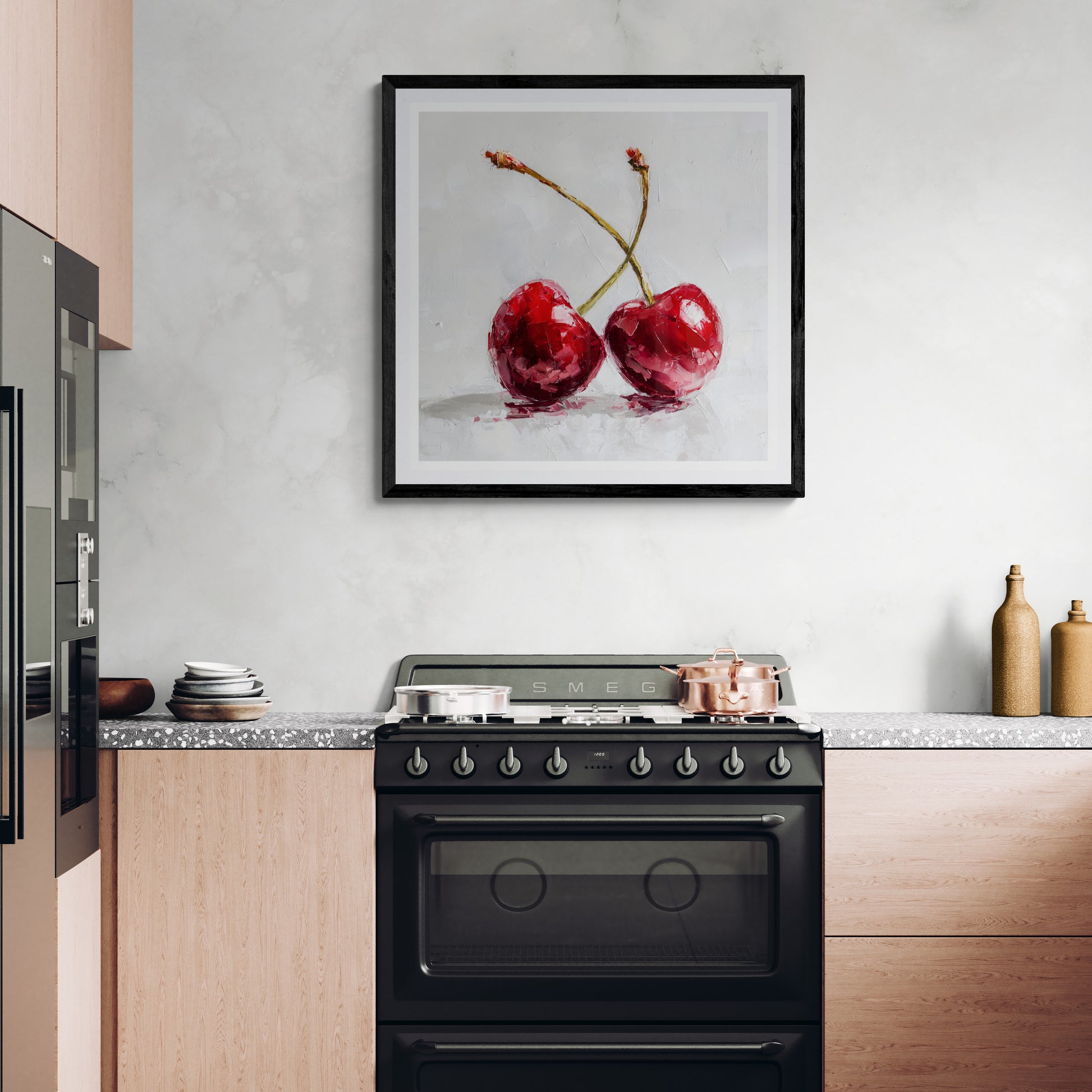 This is a vibrant and highly textured painting of two cherries, executed in a bold, expressive style that elevates the simple fruit into a striking piece of still life art.