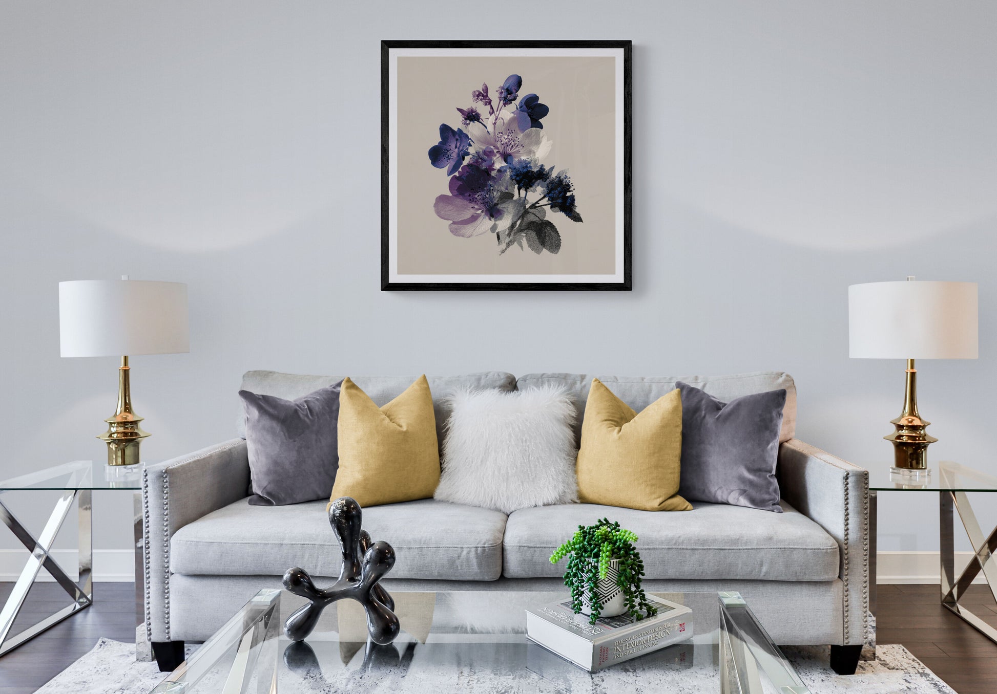 Background: A solid, neutral light grey/taupe that provides a subtle warmth.