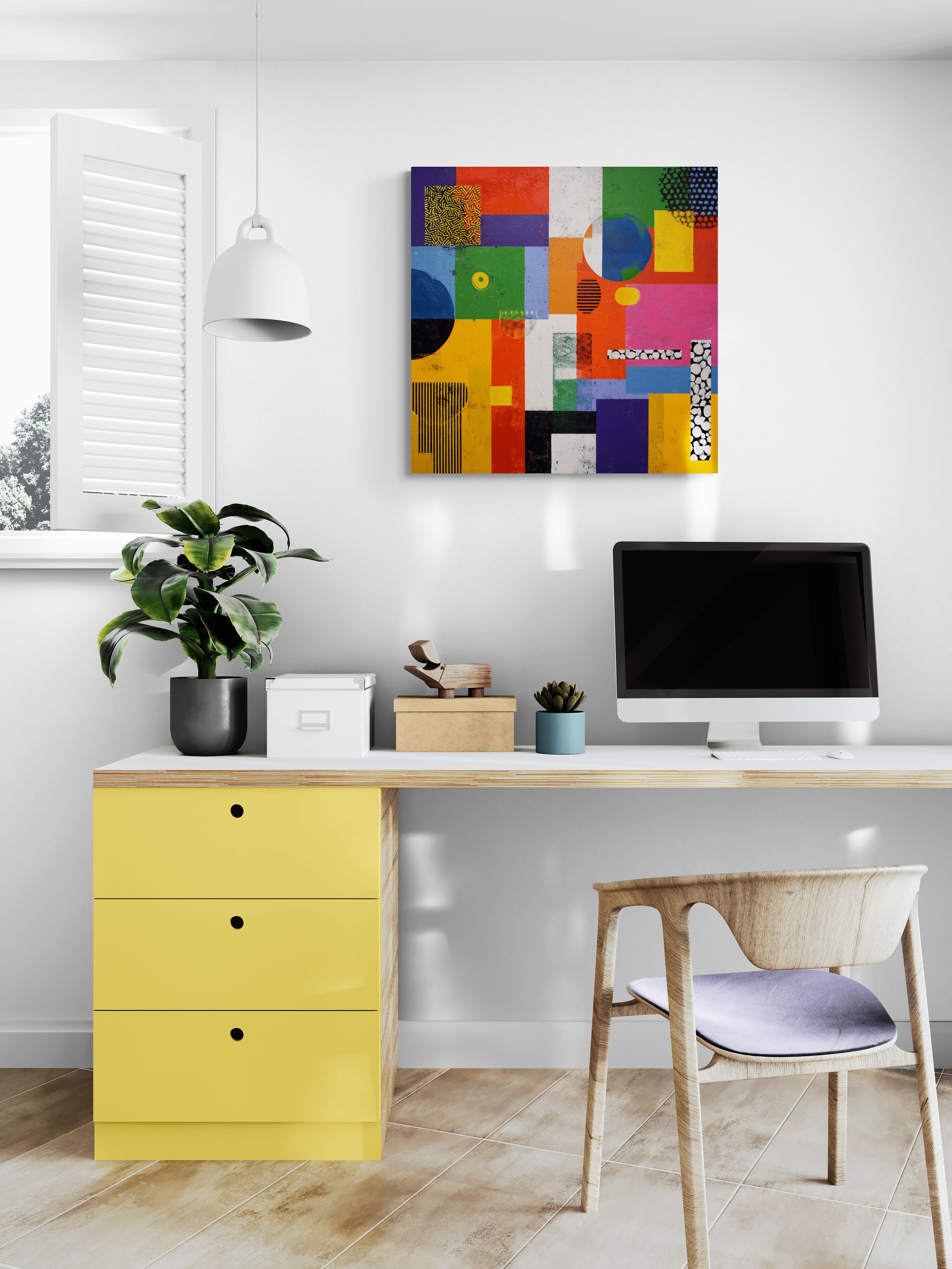 The color palette is highly saturated and bold, including bright primary colors like yellow, red, blue, and green, alongside black, white, and purple.