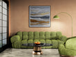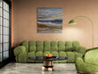 A striking, horizontal abstract painting depicting layers of ocean waves breaking near a shore.