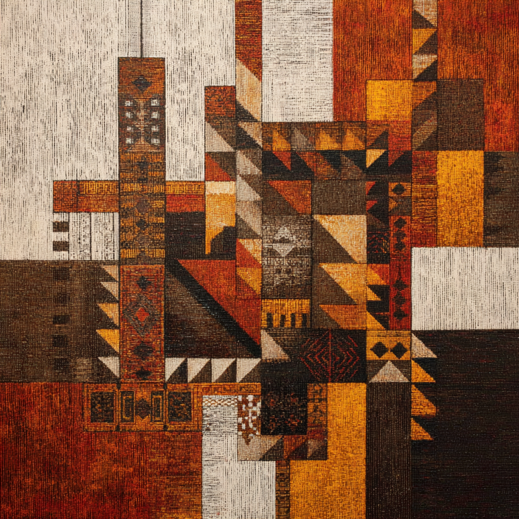 A striking mid-century geometric abstract artwork featuring layered shapes, tribal-inspired motifs, and woven-texture aesthetics in rich earth tones. This design blends retro modernism with artisanal textile influences, creating a bold yet balanced visual ideal for contemporary and vintage-inspired interiors.