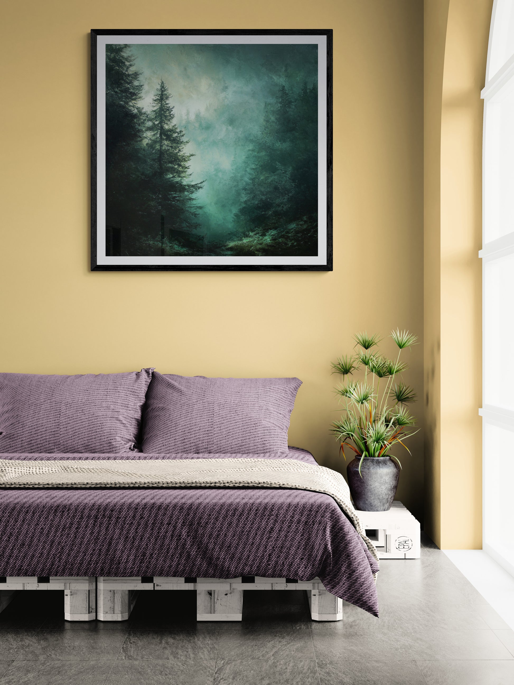 Soft emerald fog drifts through towering evergreens, creating a dramatic yet calming pine forest canvas that instantly elevates your space. The layered depth and rich green tones make it a powerful statement piece of moody woodland decor designed for modern interiors.