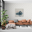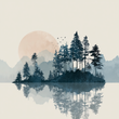A stylized and minimalist landscape featuring a cluster of dark evergreen trees on an island or peninsula.