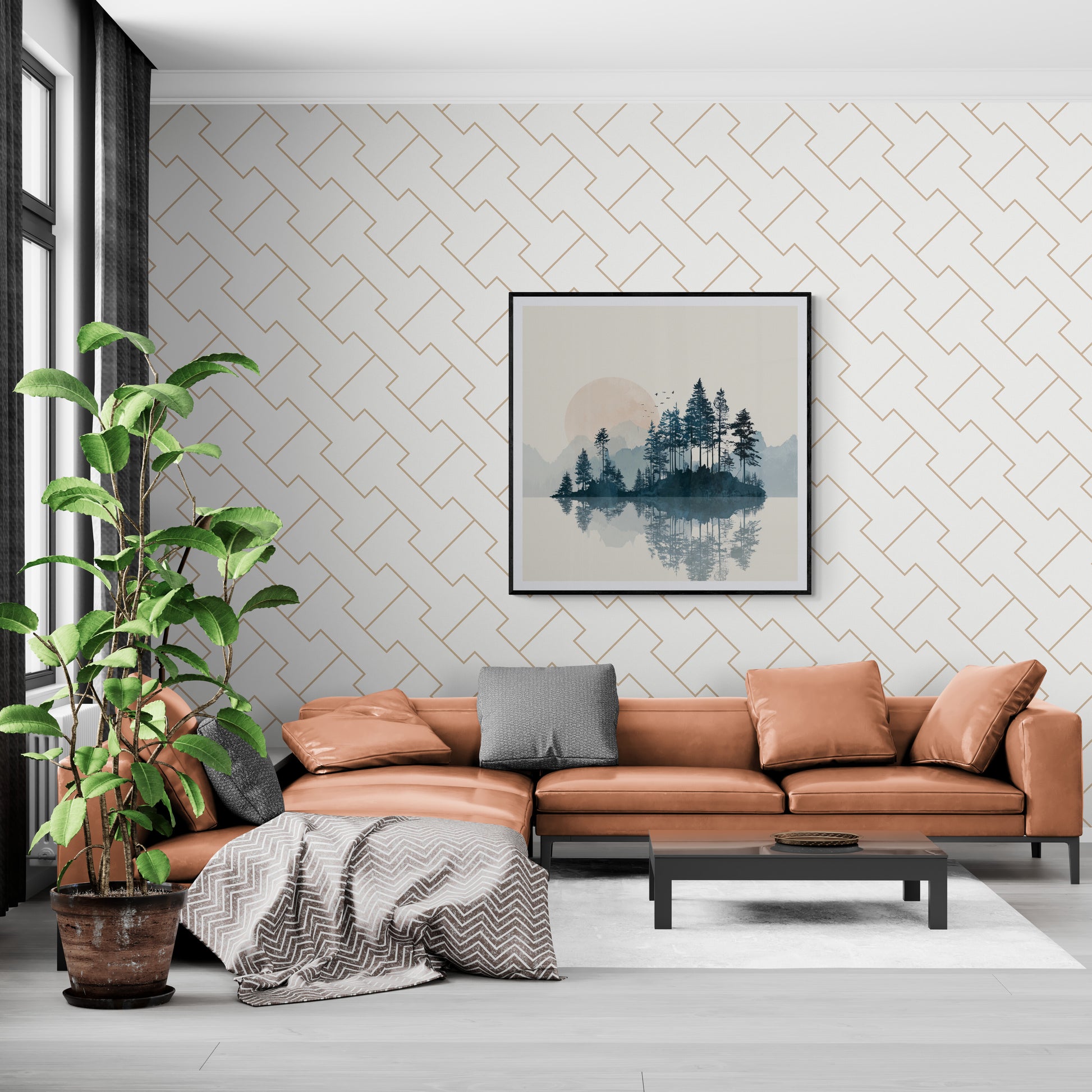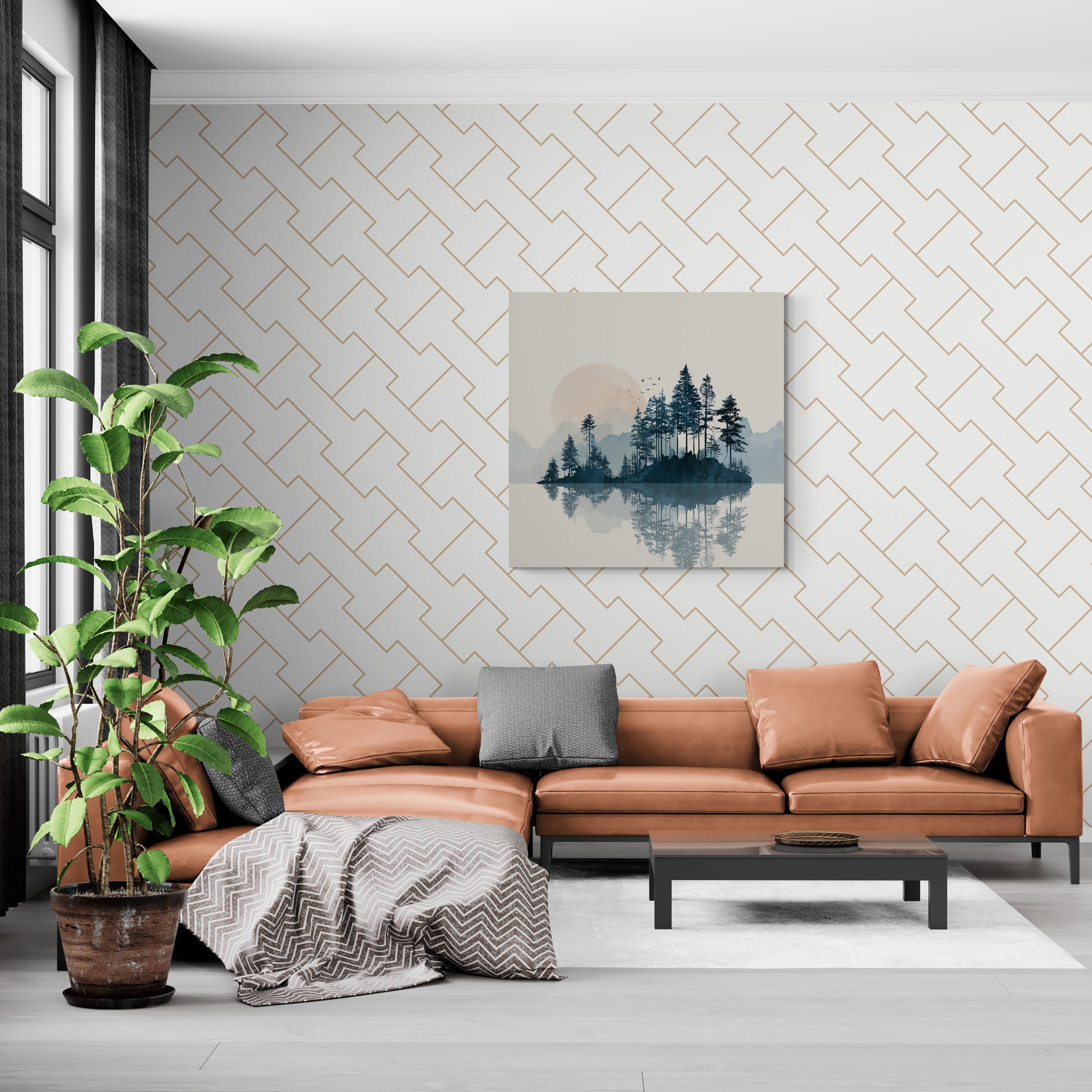 A small flock of black birds flies across the sun/moon, adding a delicate detail. The style is modern and graphic, often seen in prints and wall art.