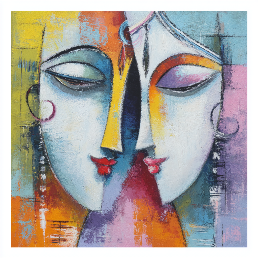 An abstract, expressionist painting depicting two faces merging into one, symbolizing duality and unity, such as the concept of Ardhanarishvara (the fusion of Shiva and Parvati) or the inseparable nature of divine masculine and feminine.