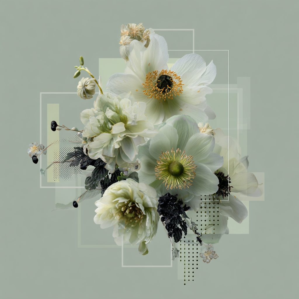 Texture/Detail: The flowers are rendered with exceptional detail (focus on stamens and petals), which contrasts with the flat, graphic overlay.