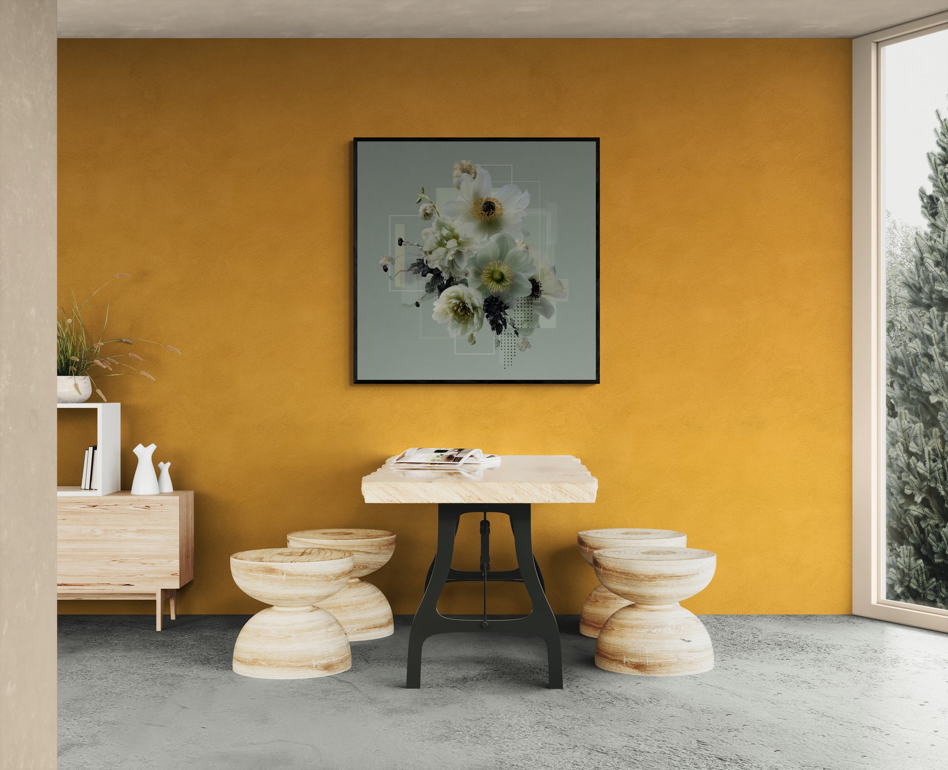 Composition: The flowers are intentionally placed over a layer of abstract, monochromatic geometric shapes (squares, lines, rectangles), creating a contrast between organic and structured forms.