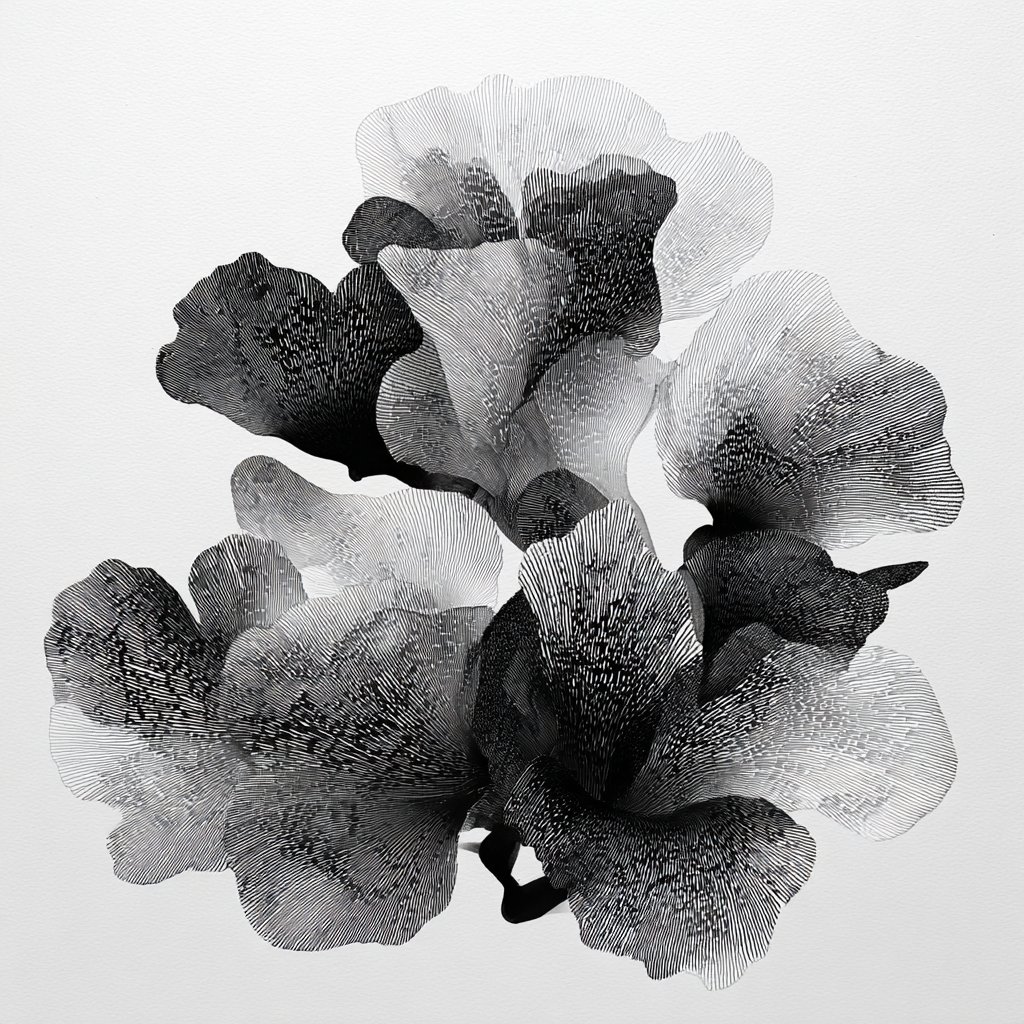 Technique: The forms are built up using a combination of solid black fills and intricate fine, hand-drawn lines (like cross-hatching or stipple) that suggest a delicate, wispy texture.