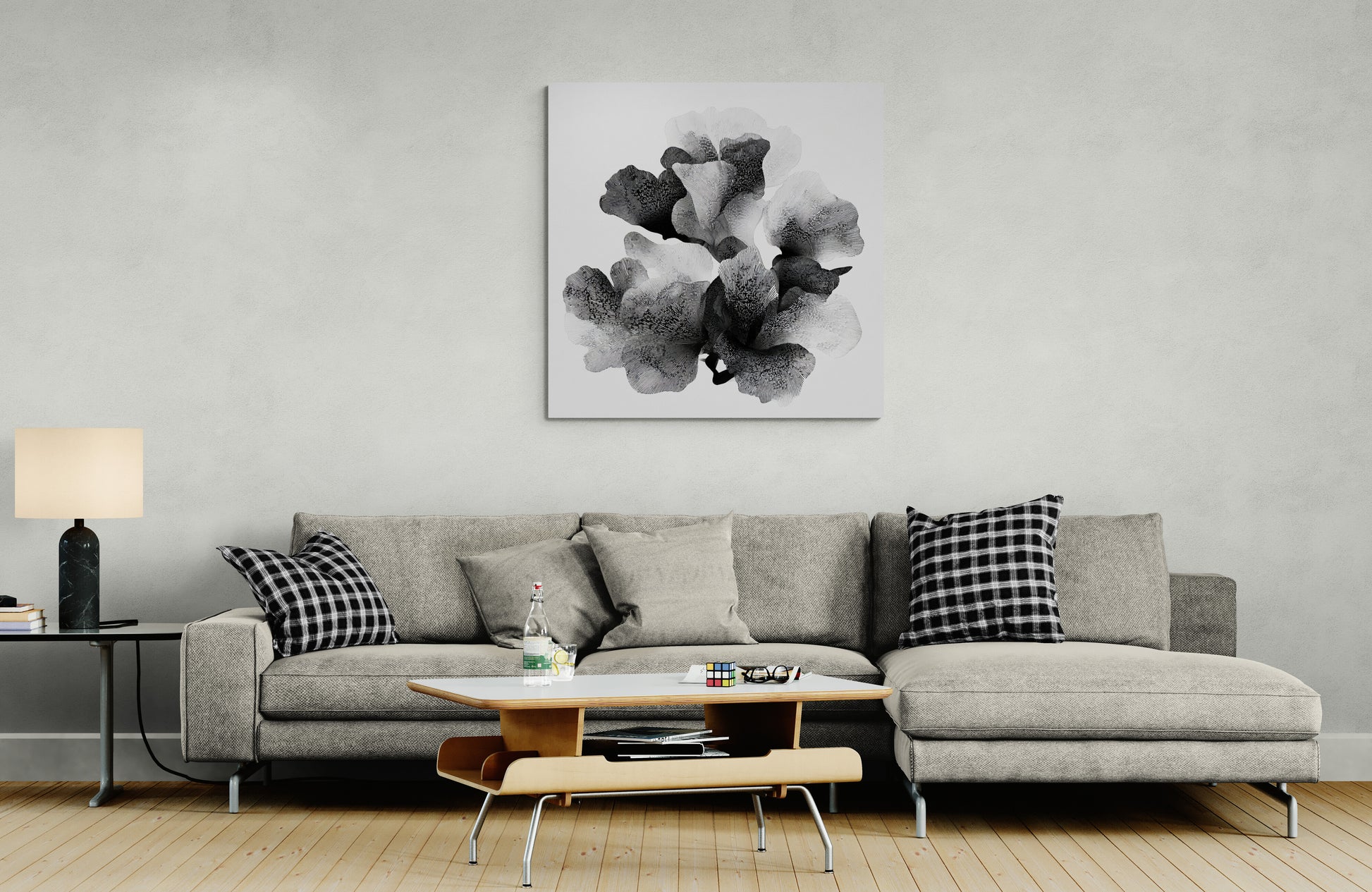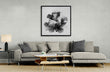 Style: A modern, graphic piece using high contrast and intricate line work to define volume and form, resembling either stylized flowers, coral, or seaweed.