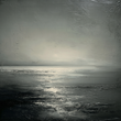A highly textural, minimalist, and monochromatic abstract painting of a seascape or horizon line.