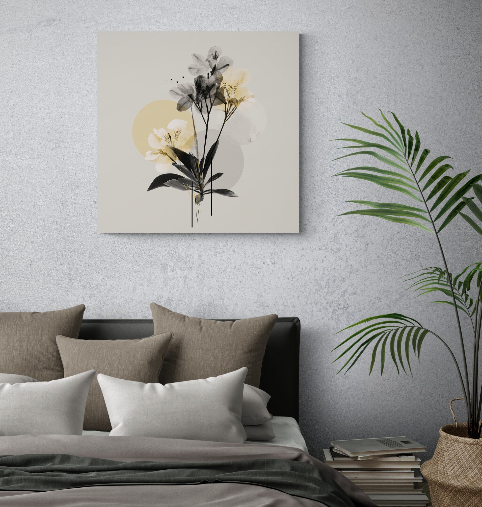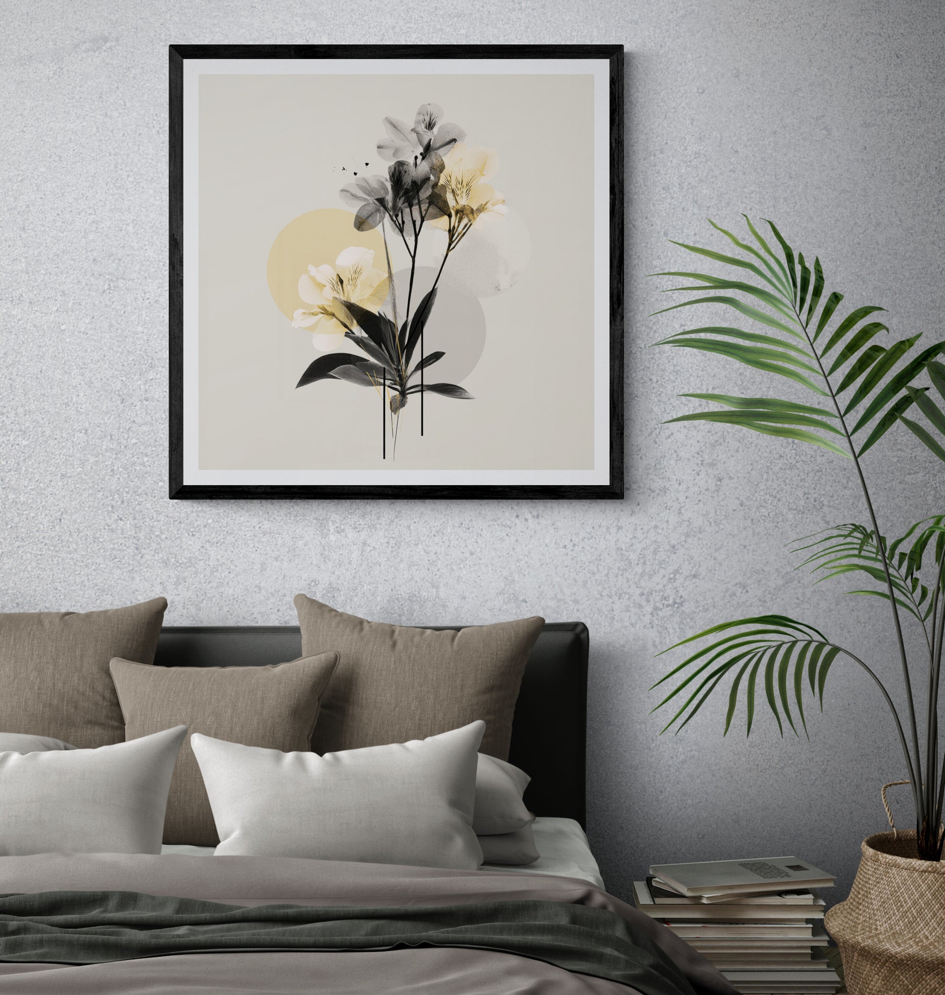 Mood: The artwork is clean, minimalist, and highly decorative, successfully blending realistic form (the flowers) with abstract, graphic simplicity.