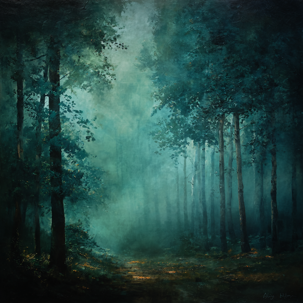 This atmospheric woodland artwork captures towering trees emerging through soft mist, illuminated by subtle rays of light. The deep emerald greens and shadowed forest tones create a dramatic yet calming presence that instantly elevates your space.
