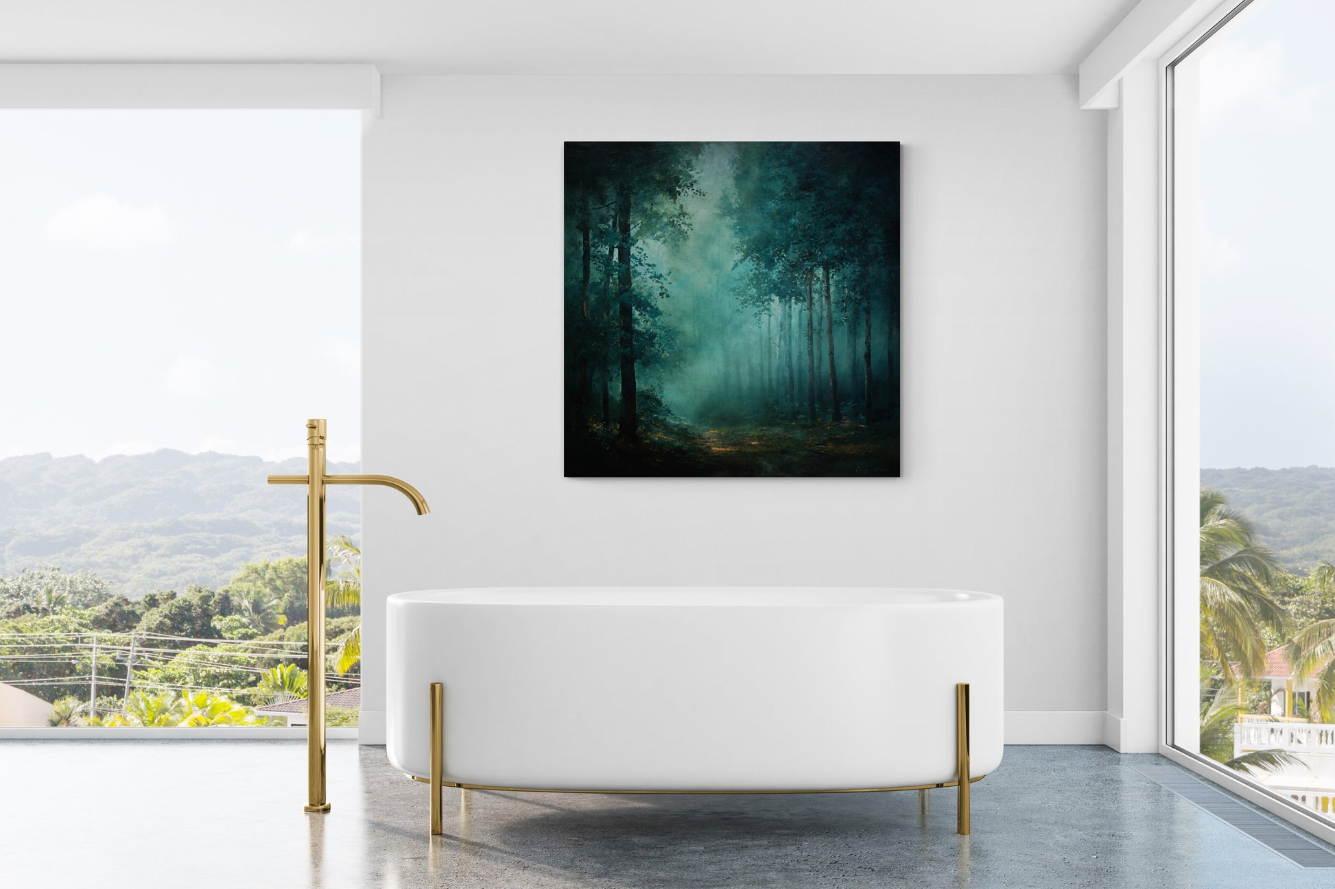 Whether styled above a sofa, fireplace, or bed, this misty woodland canvas creates a powerful yet peaceful visual escape.