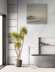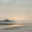 This serene coastal landscape captures distant mountains against a soft golden horizon, reflected across a tranquil shoreline. The muted beige and sand-toned palette makes it the perfect statement piece for minimalist, Scandinavian, and modern interiors.