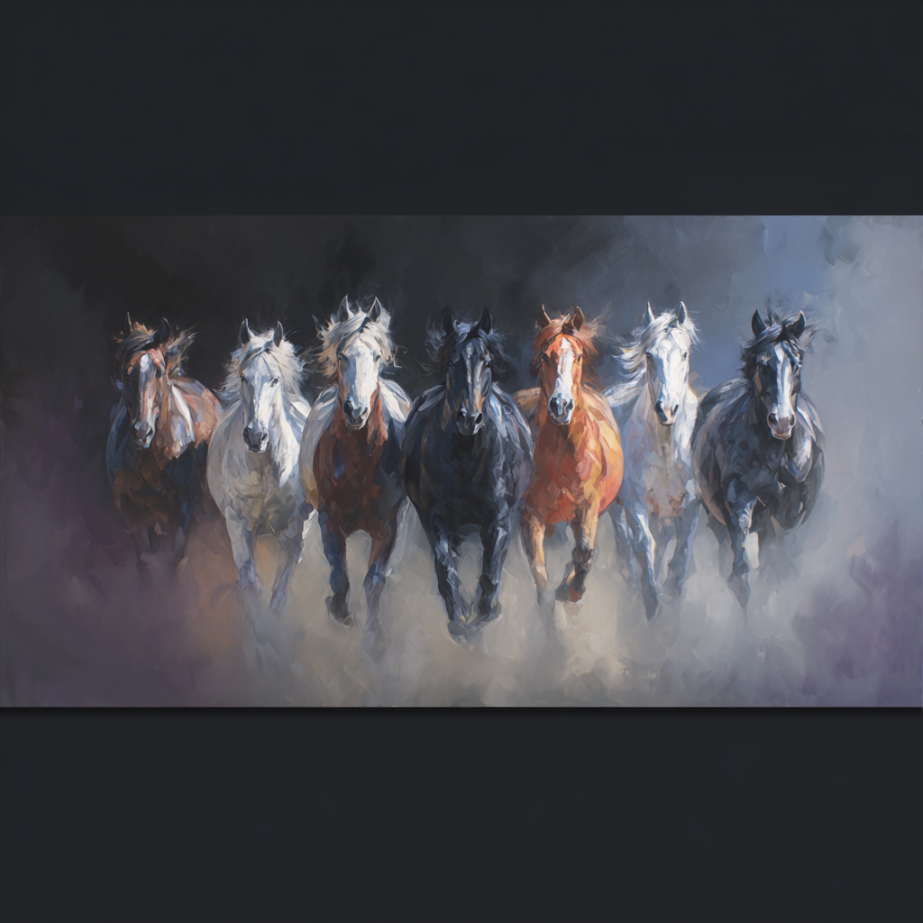 Style and Technique: The artwork utilizes the characteristic Impasto / Thick Oil Painting technique with a loose, atmospheric finish. The horses' forms are slightly blurred by the expressive, sweeping brushstrokes, reinforcing the sense of speed and the misty or dusty environment they are galloping through. The thick paint gives the image a rugged, three-dimensional texture.