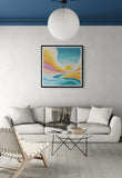 Subject: An abstract seascape depicting large, stylized waves rolling beneath a rising or setting sun (a large yellow circle) and a colorful sky.
