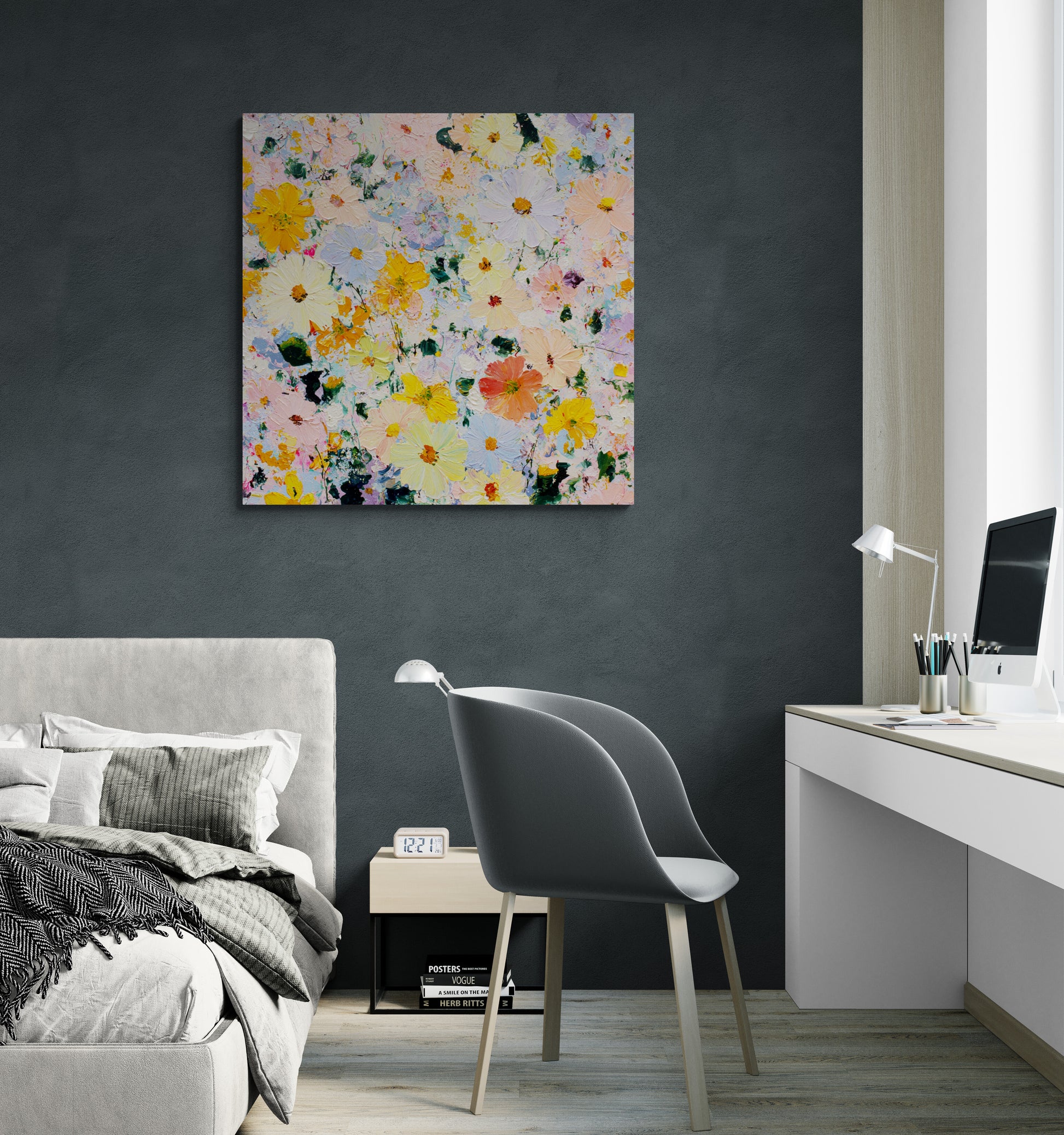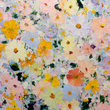 A cheerful and highly textured painting depicting a dense, abstracted meadow of cosmos-like wildflowers. The artwork uses a heavy impasto technique, where thick dabs and smears of paint create a sparkling, three-dimensional surface, suggesting flowers and foliage.