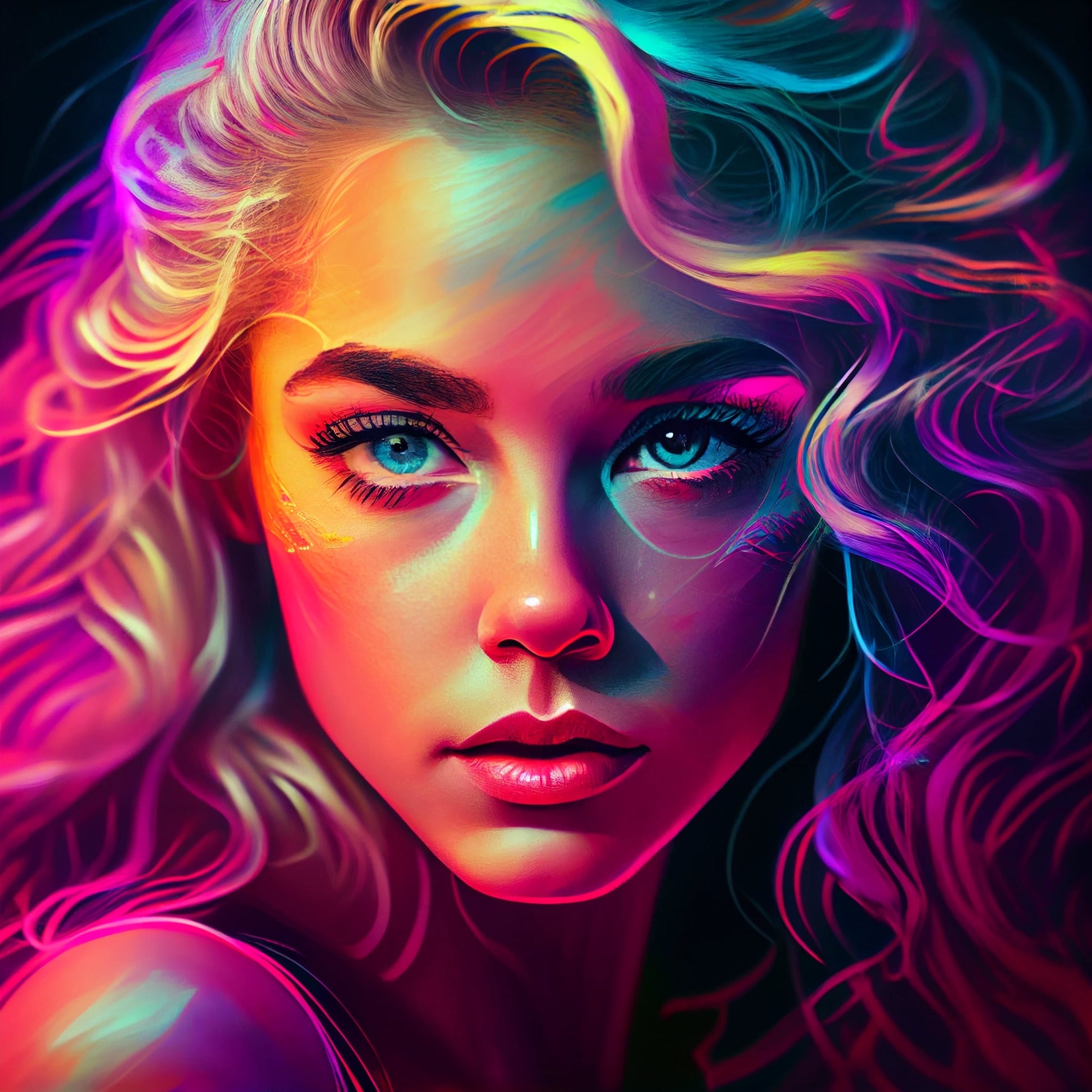 In this painting, we see a young girl with a striking psychedelic style. Her hair is curly and flowing, styled in loose waves, and adorned with colorful accessories like beads and feathers.