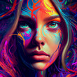 - In this painting, we see a young girl with a striking psychedelic style. Her hair is long and flowing, styled in loose waves, and adorned with colorful accessories like beads and feathers. Her makeup is also eye-catching, with bright colors and intricate patterns that complement her overall appearance.