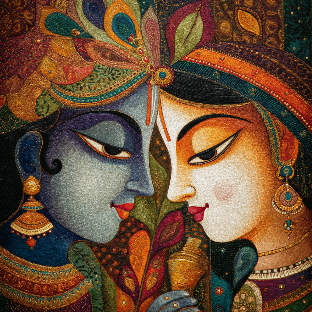 Radha and Krishna expressed in a narrative art form hinting at a divine story through composition