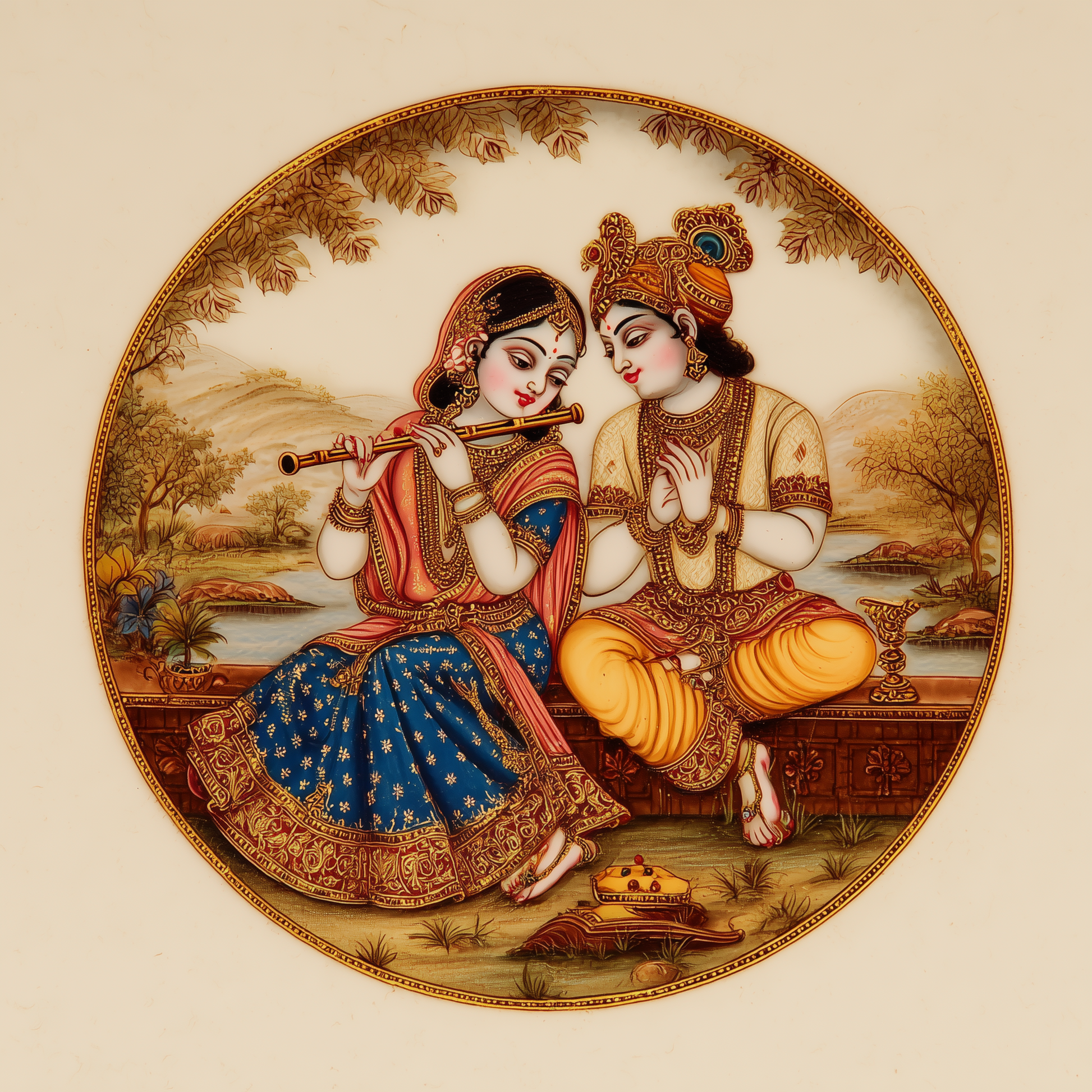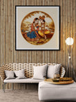 This Radha and Krishna medallion landscape painting tells a gentle story of divine love, devotion, and togetherness. Set within a beautifully balanced medallion frame, Radha and Krishna appear in a peaceful pastoral landscape, inviting the viewer into a moment of calm and spiritual connection.