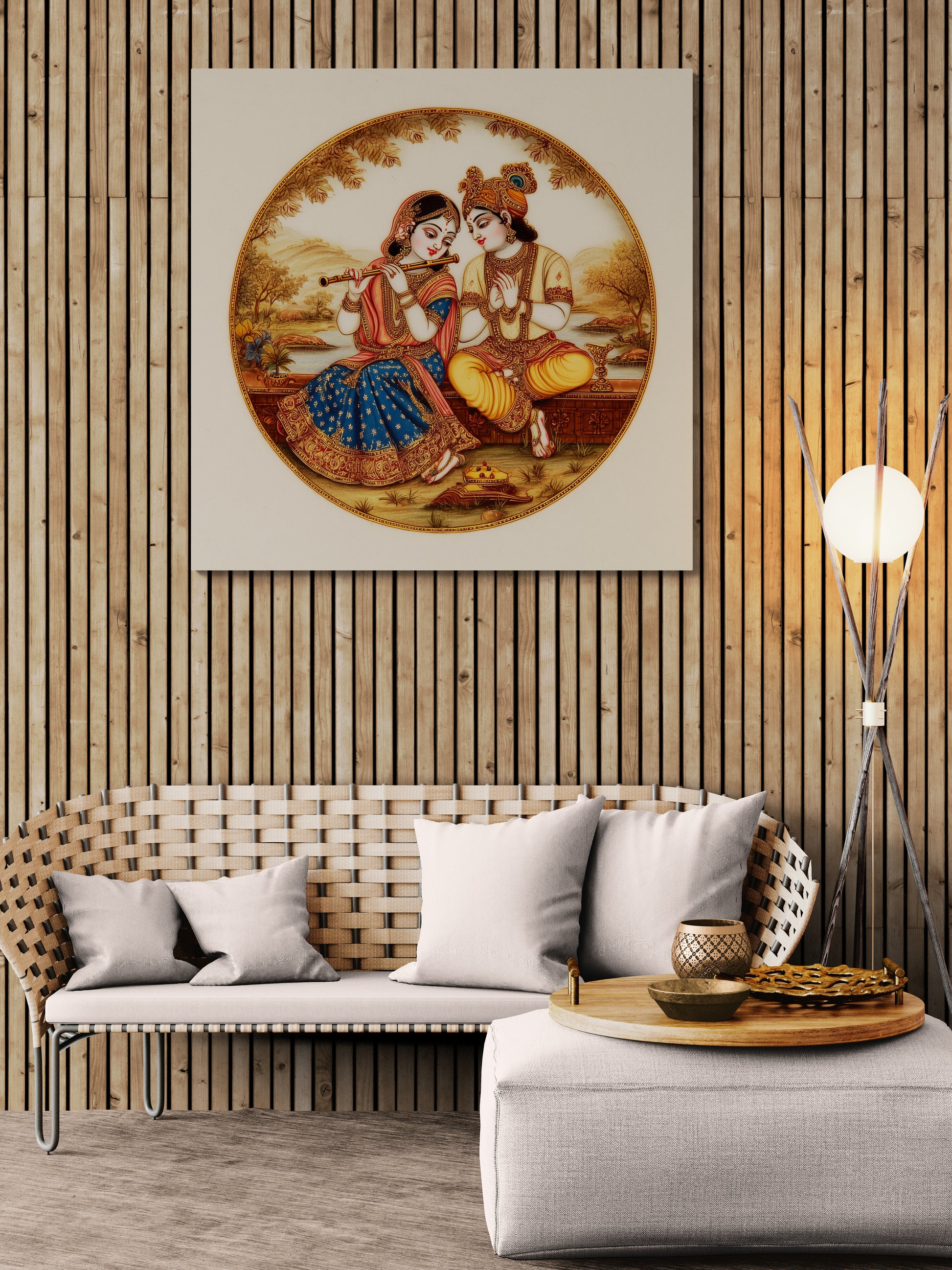 Inspired by traditional Indian devotional art, the scene feels timeless and serene. Soft natural elements surround the figures, while the medallion design draws your eye toward their quiet bond and graceful presence. The artwork carries a sense of harmony that makes it especially meaningful for those drawn to Hindu spiritual wall art.