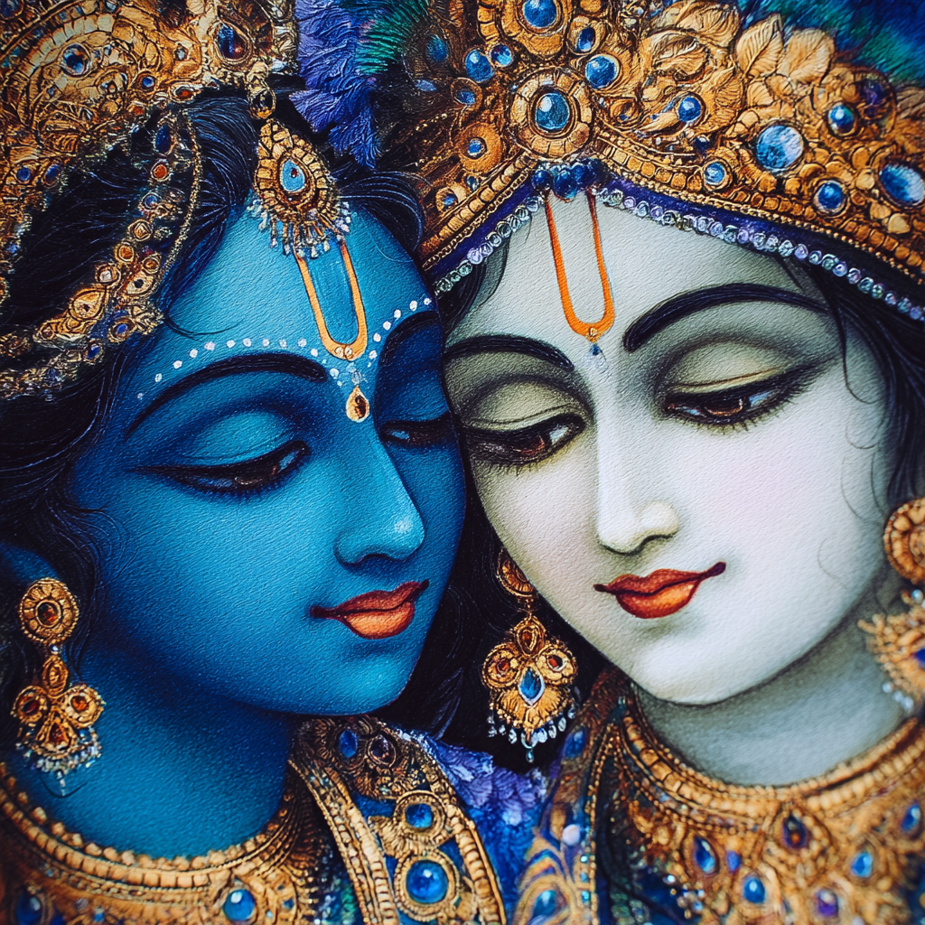 Krishna (left): Has the customary deep blue complexion, looking downward with a gentle smile. His jewelry and crown are rich blue and gold.