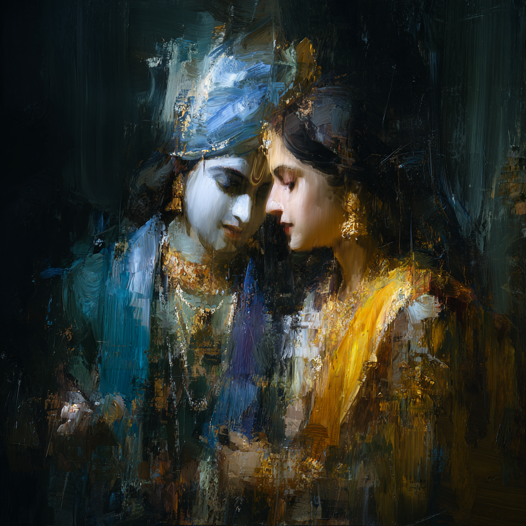 Radha and Krishna shown through impressionistic strokes, focusing on light and feeling