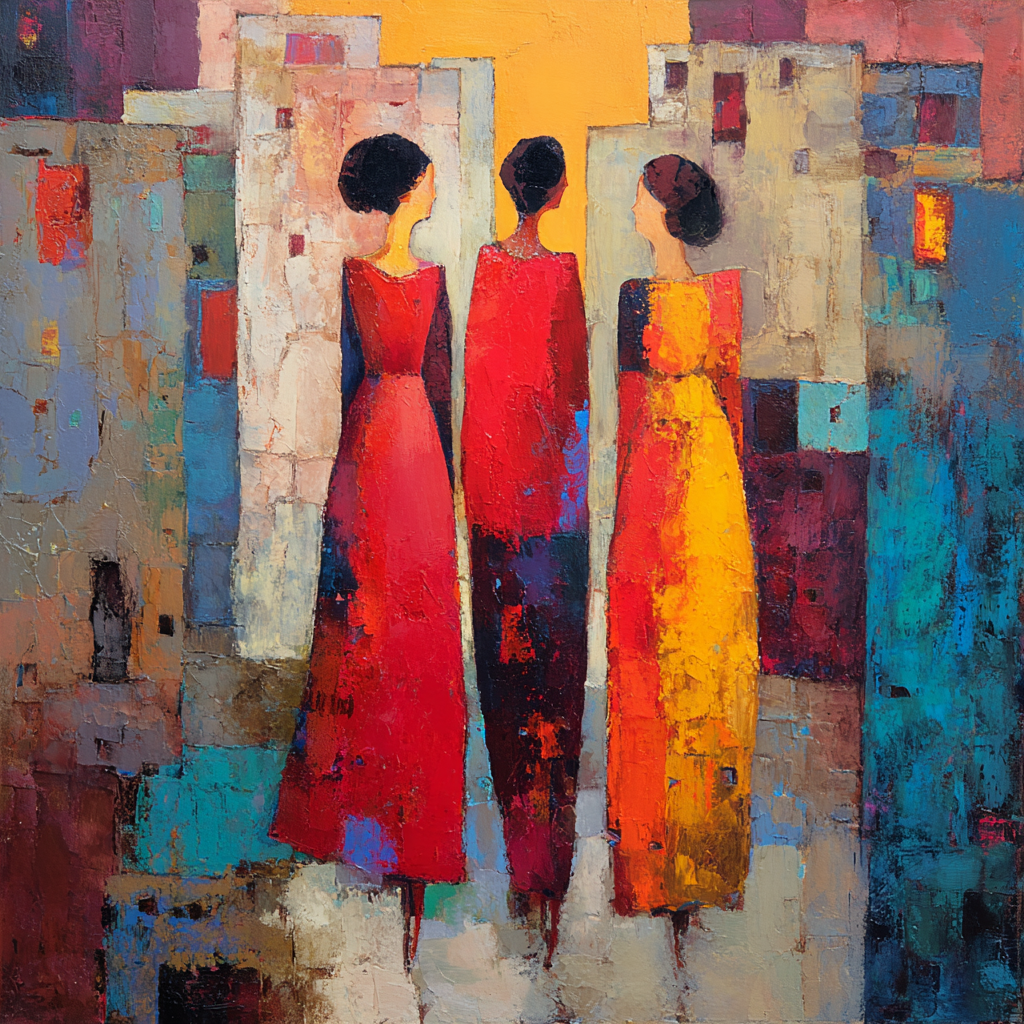 Figures: The figures are simple, columnar shapes emphasizing the vibrant colors of their dresses or robes: