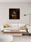 The figures are seated outdoors in a lush, dark grove or forest setting, with dramatic lighting (chiaroscuro) highlighting the central couple against the shadows.