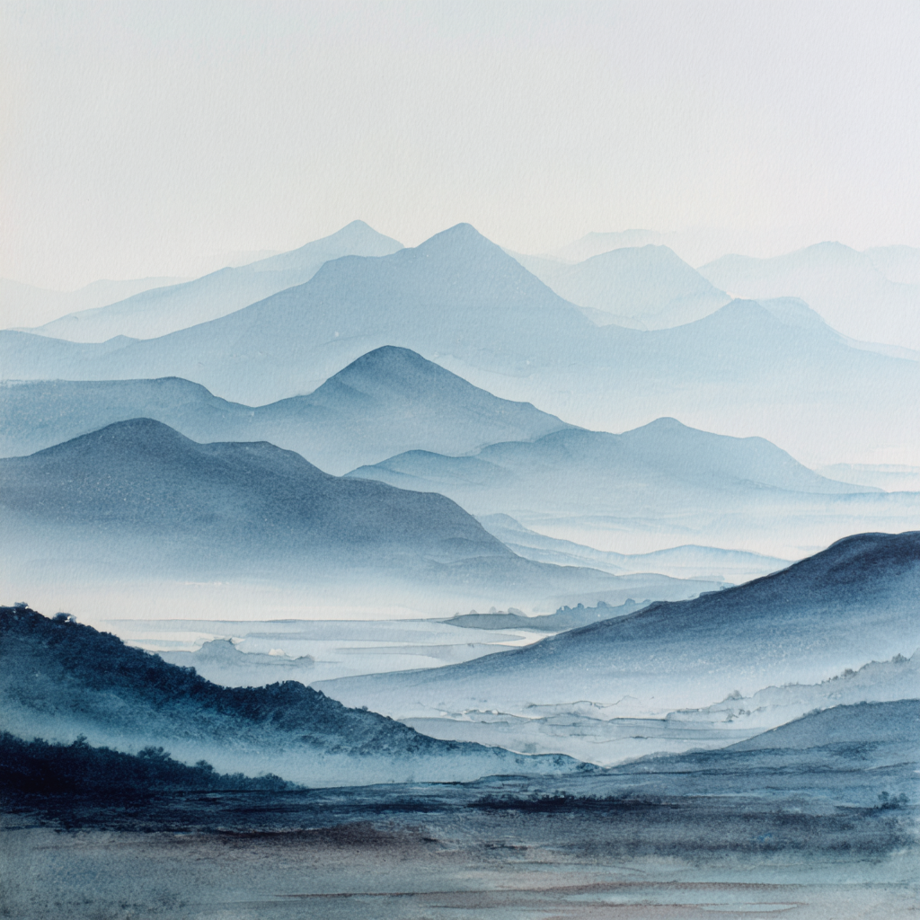 Soft watercolor landscape of distant mountains in mist gentle blue gray palette relaxing and minimalist