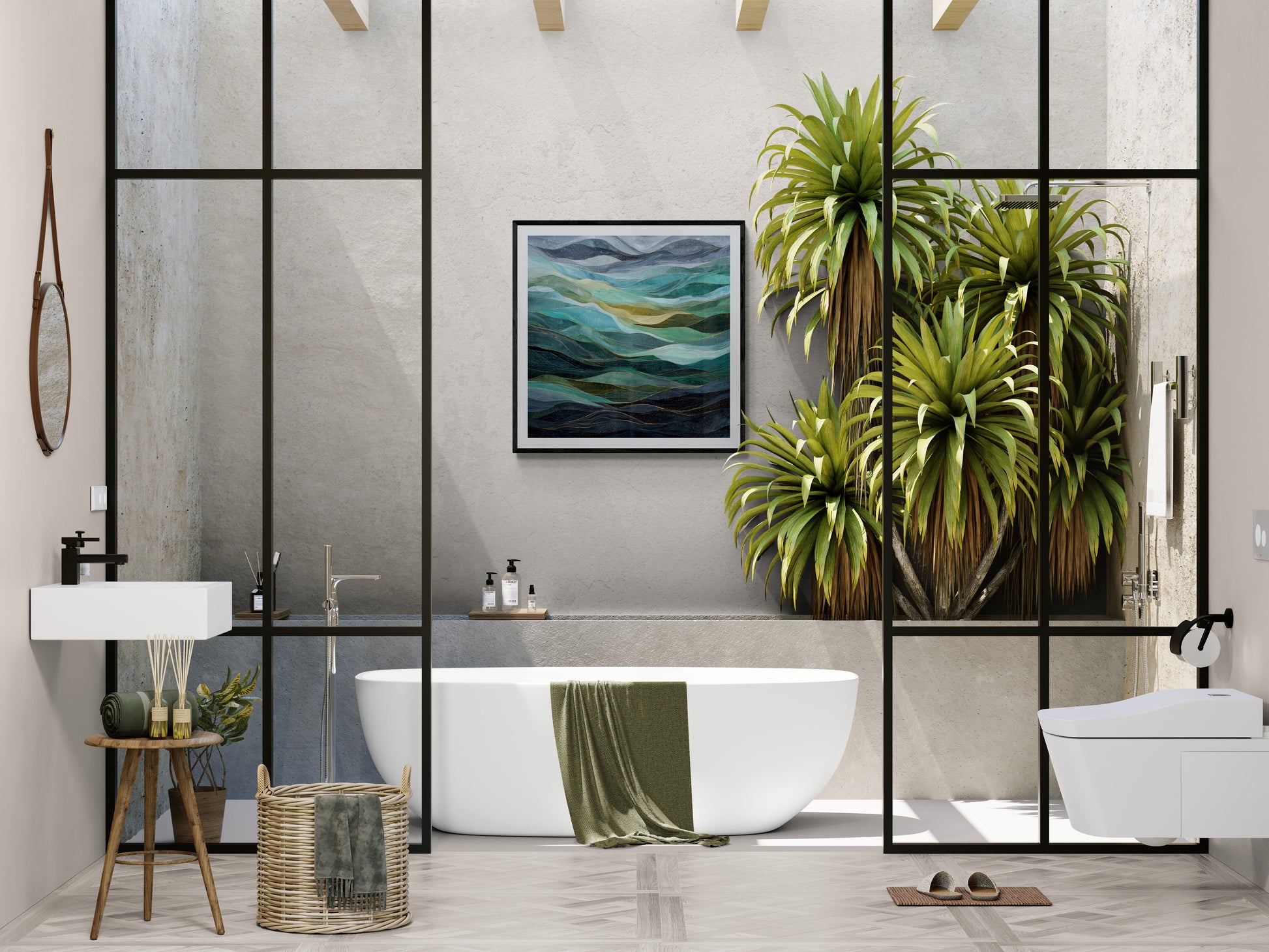 The primary color palette is rich and deep, featuring various shades of teal, turquoise, deep blue-green, emerald green, and gold.