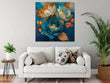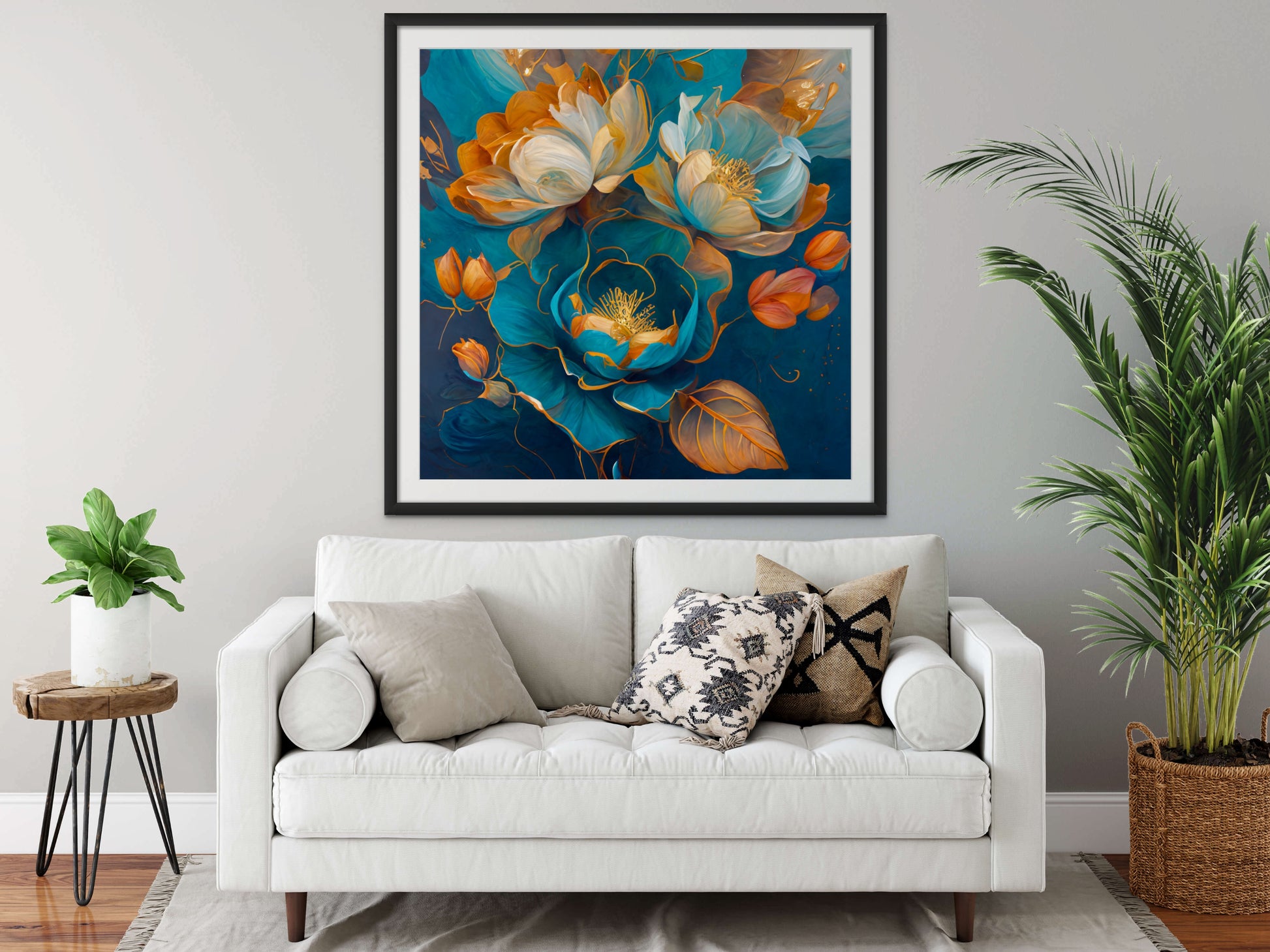 - To meet your preferences, the digital print of the oil painting of teal blue and golden-orange flowers can be made in different sizes and printed on various substrates, including canvas or paper.