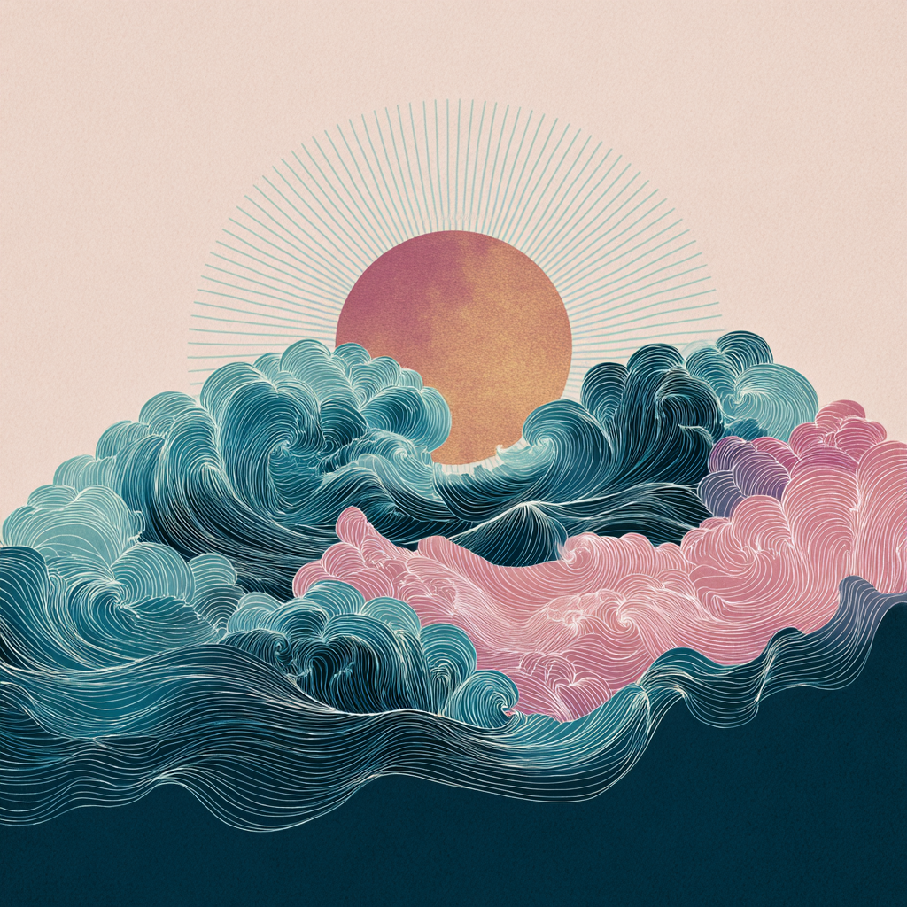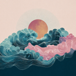Subject: A central, prominent sun disk rising over a foreground of large, stylized breaking waves and swirling clouds.