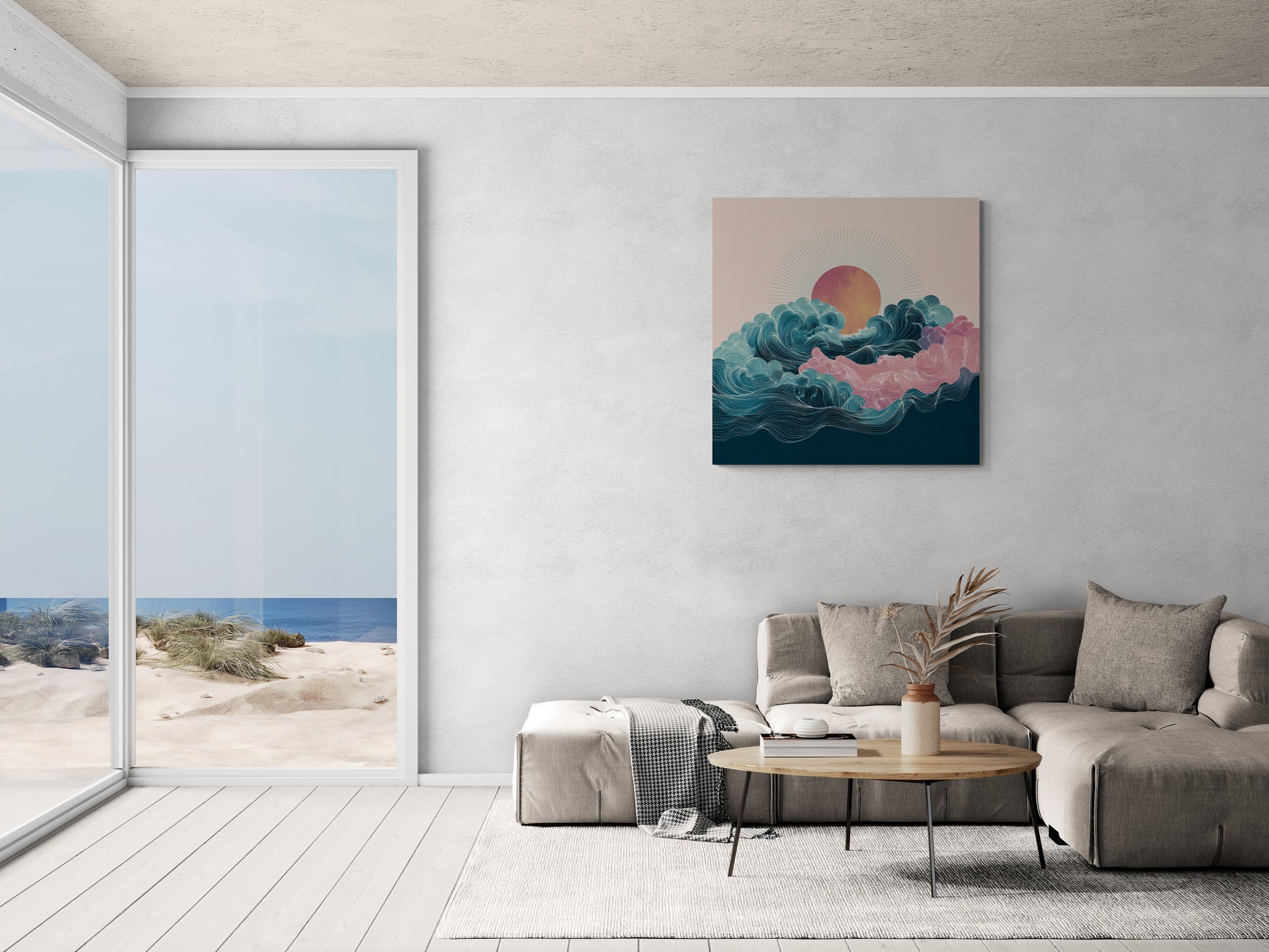 Composition: The scene is divided by the large circular sun, with the foreground dominated by undulating, rhythmic lines forming the ocean waves.