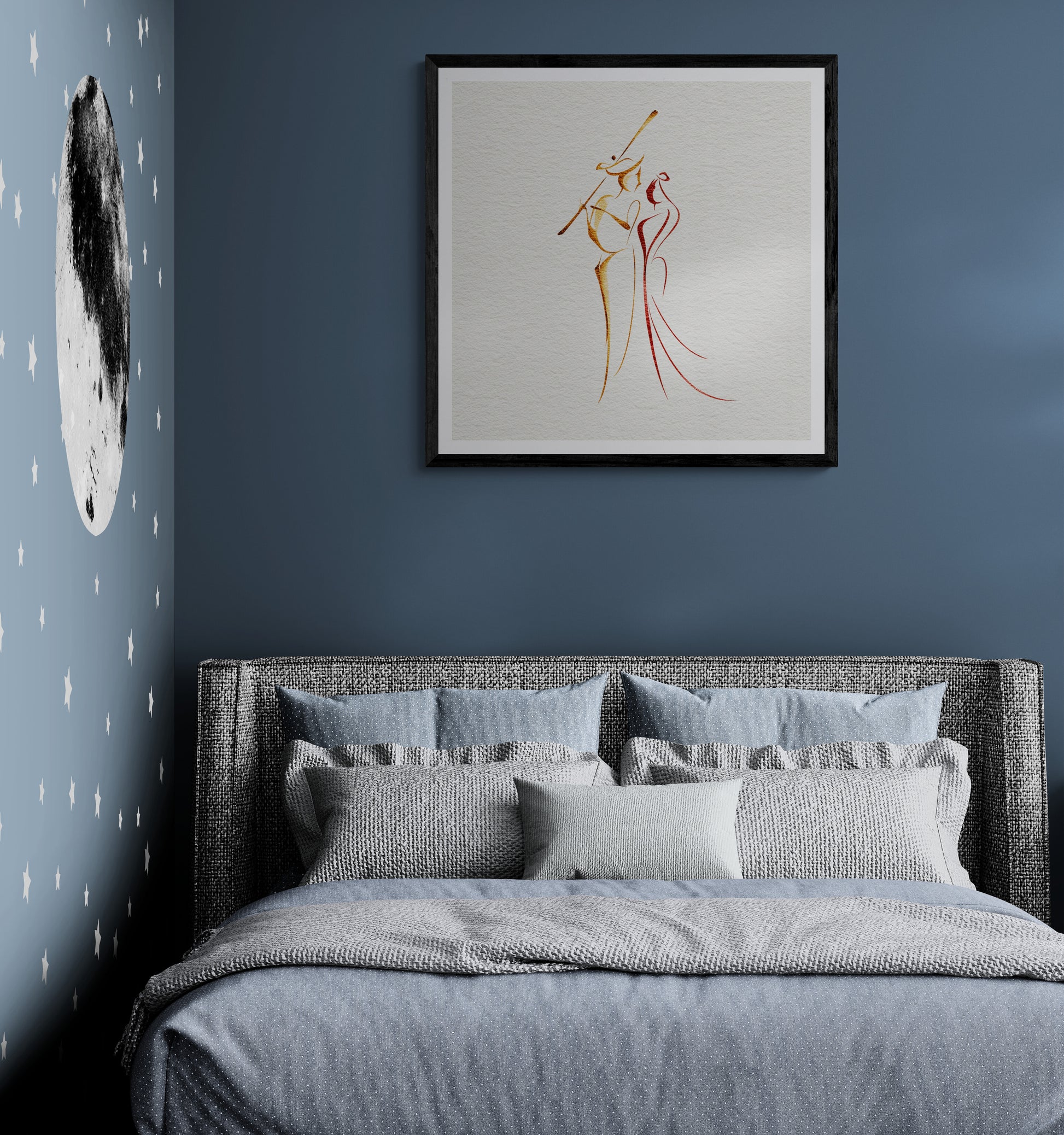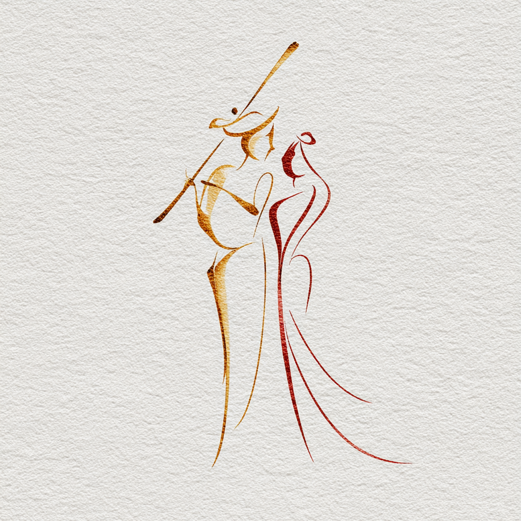 Warm Color Palette: Uses rich, earthy colors—predominantly deep gold/ochre (suggesting Krishna) and a rich crimson/maroon (suggesting Radha)—against a pale, textured background.