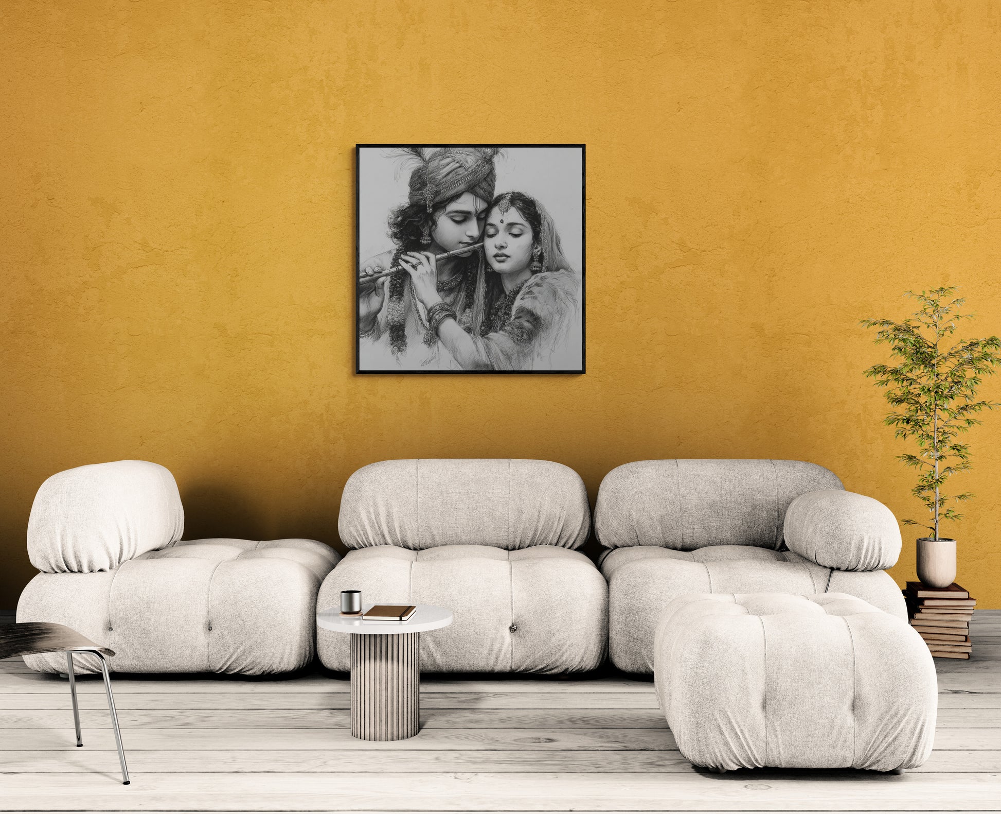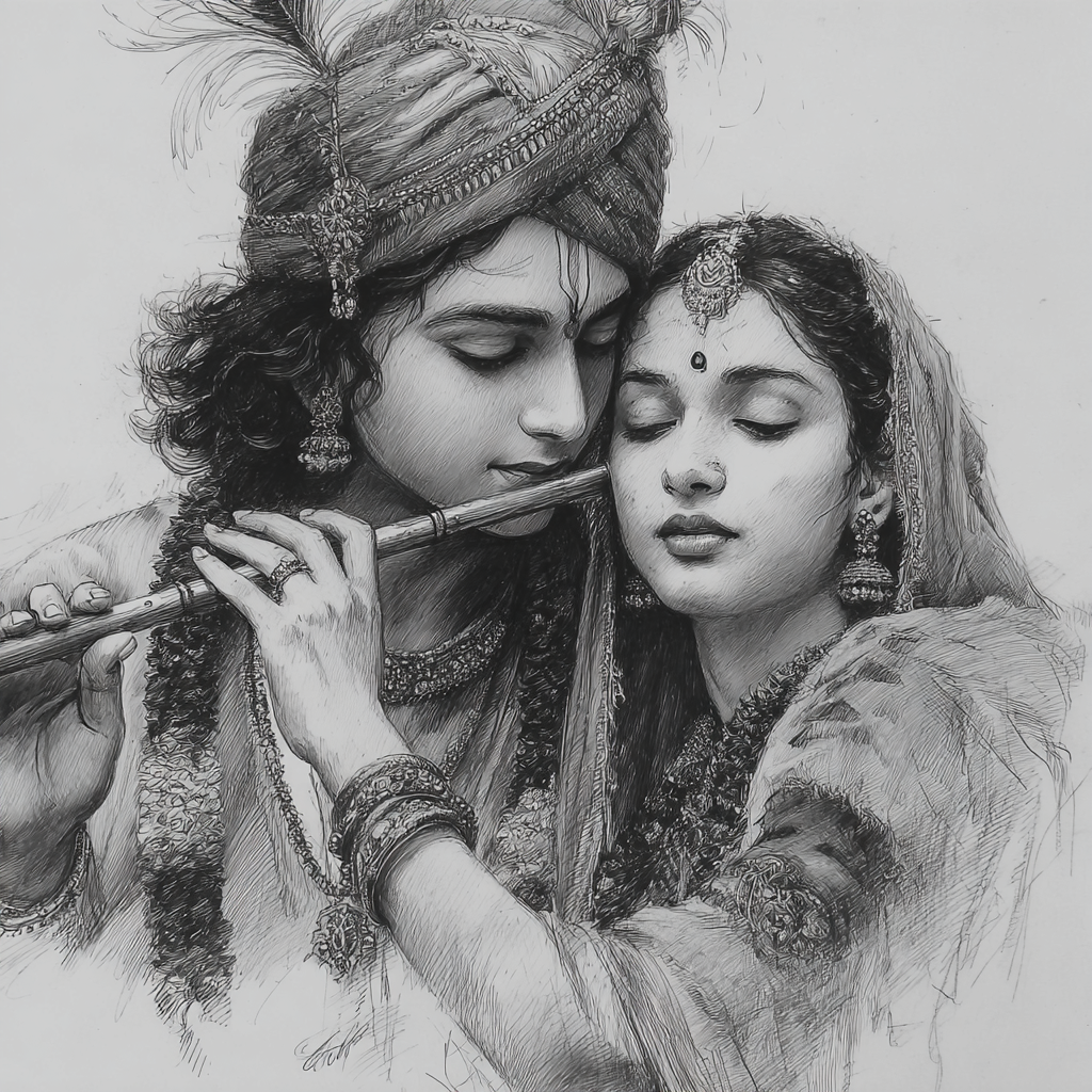 The Pair: The central focus is the loving, intimate, and divine connection between the Hindu deities, Krishna and Radha.