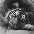 Tiger: Lying down, with its head tilted slightly, resting one cheek/muzzle on its paw.