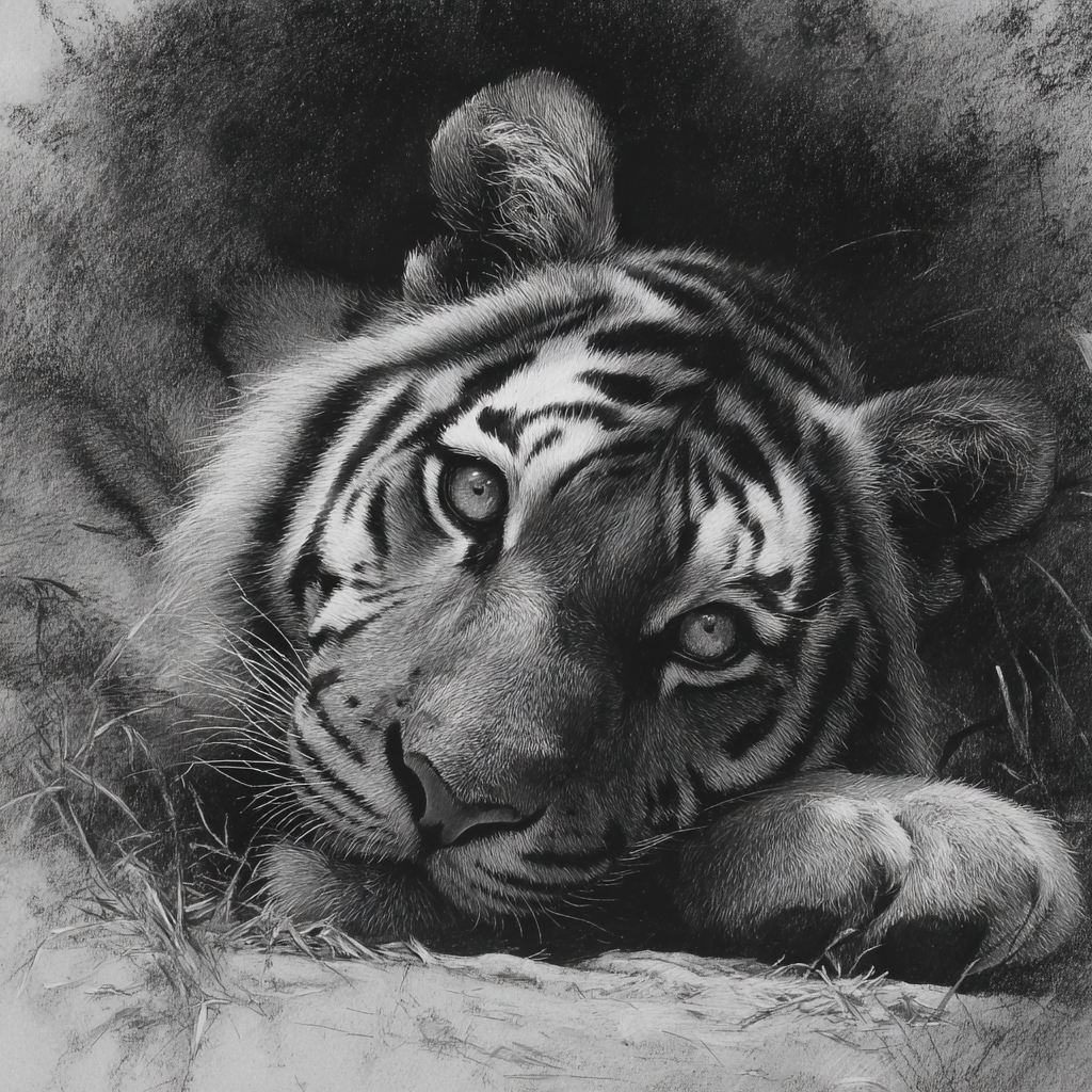 The detail in the fur, particularly around the head and paws, suggests a charcoal drawing, pencil sketch, or detailed digital rendering.